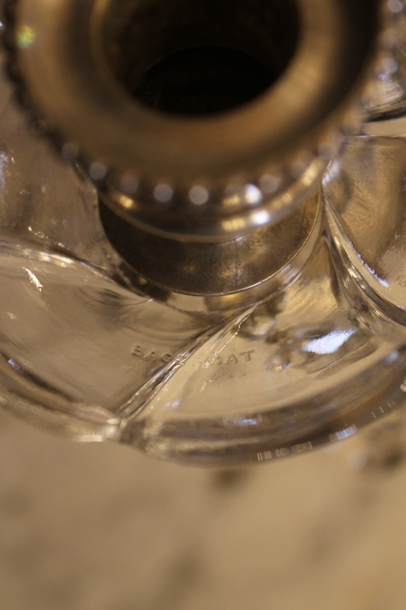 Les coupelles sont signées BACCARAT en lettres bâton et en relief, marque apposée à partir de 1875 sur les pièces pressées moulées.