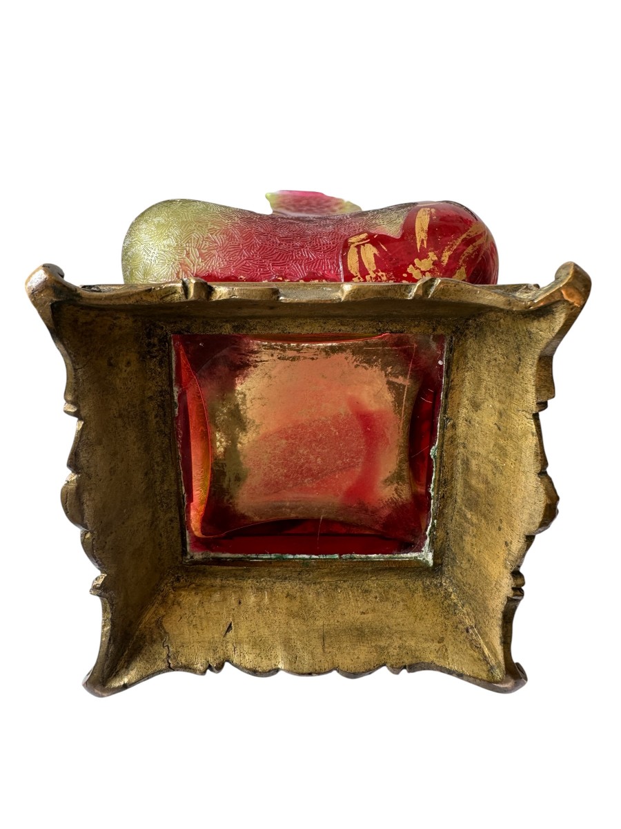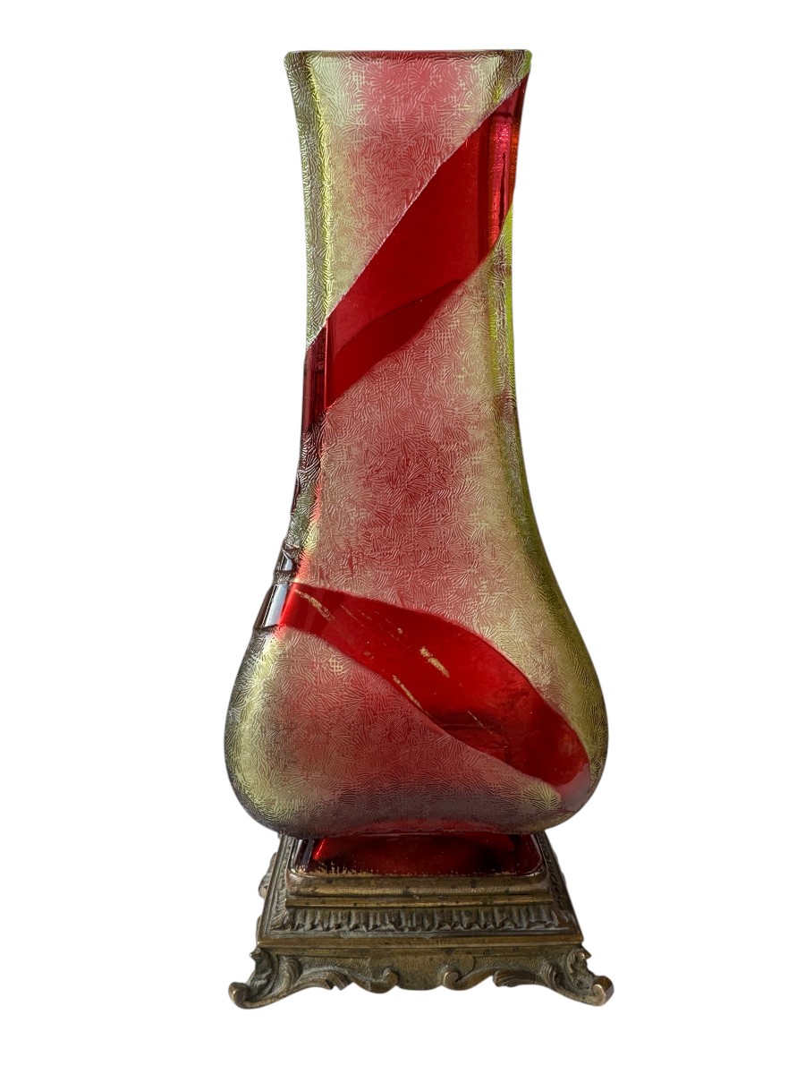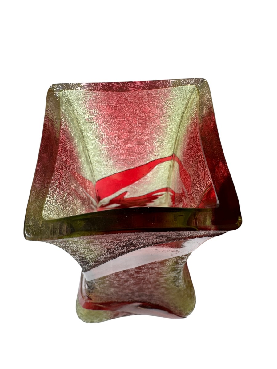 Vase carré en verre gravé en relief à l'acide à décor des tigridias rouges rehaussées en or sur un fond givré vert à reflets rose rubis. Fabriqué par la cristallerie Baccarat vers 1878. Le vase repose sur une monture métallique, H. 21 cm