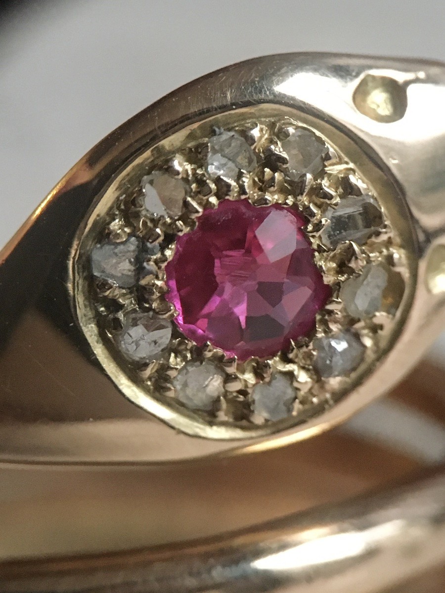 Bague ancienne en or rose 18K en forme de serpent enroulé, sertie d’un rubis d’environ 0.40 ct entouré de 10 diamants taille rose.