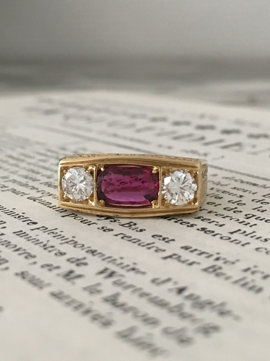 Bague Art Déco en or jaune 18K ornée d’un rubis de Siam ( Thaïlande ) non chauffé taille ovale pour environ 1,11 ct et de deux diamants taille brillant pour environ 1 ct. ( Deux diamants sont estimés F/ VVS ).