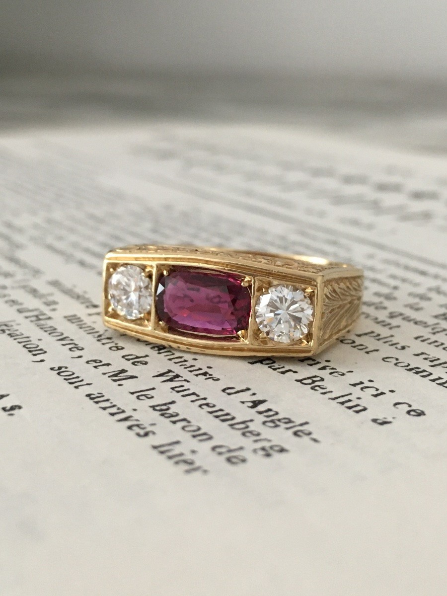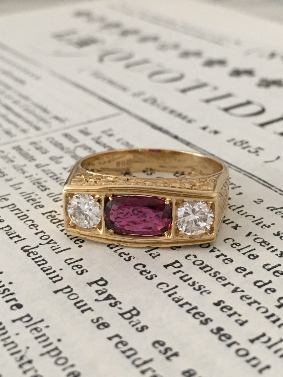 Retrouver le mobilier ou les objets d''art similaires à « Bague Art Déco en or jaune ornée d’un rubis non chauffé et diamants » présenté par Maison Tres Or, antiquaire à Etterbeek dans la catégorie Bagues Art Déco, Bijouterie, Joaillerie.