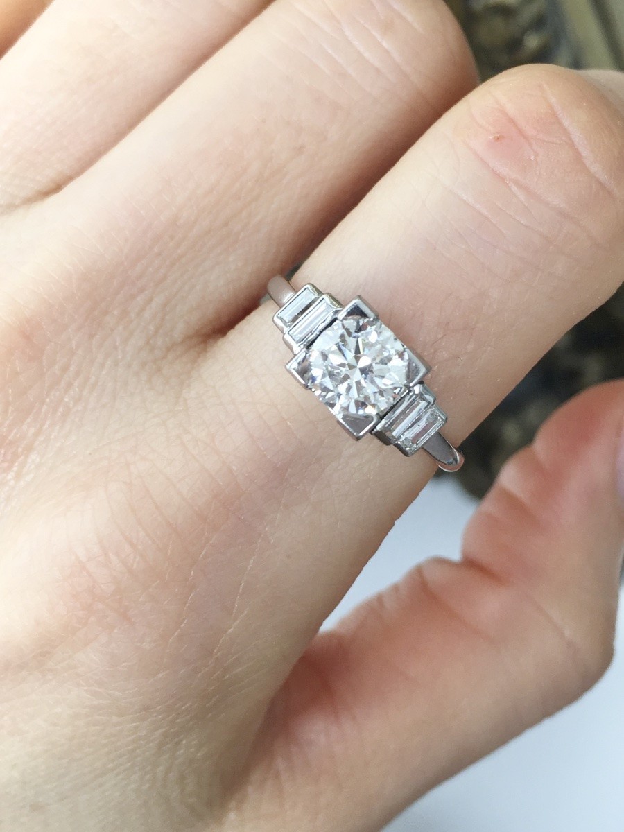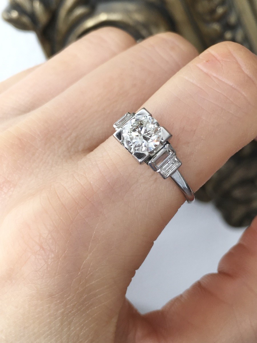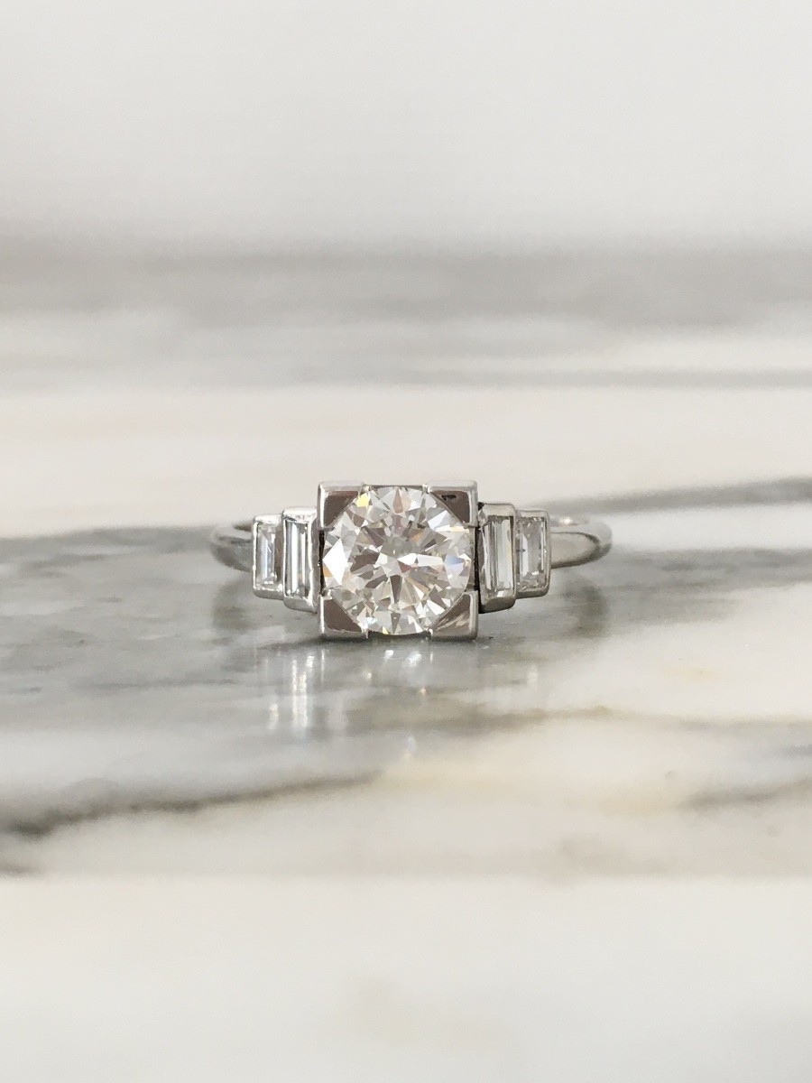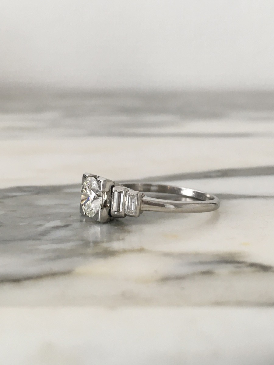 Bague Art Déco en platine centrée d’un diamant taille brillant pour environ 1,15 ct ( couleur H /pureté VVS ). Le diamant est épaulé de chaque côté de 2 diamants tailles baguettes pour un total d’environ 0,40 ct (couleur F-H /pureté VS-SI ).