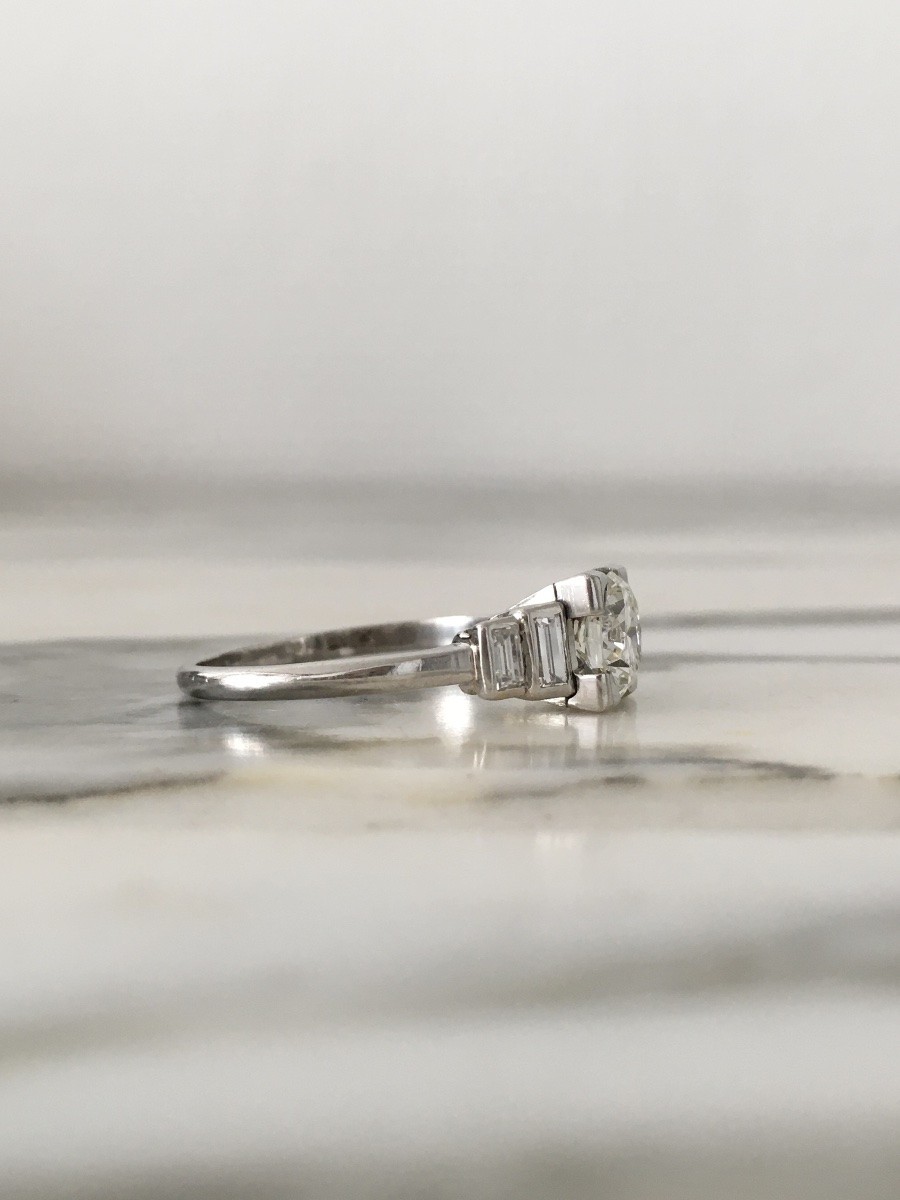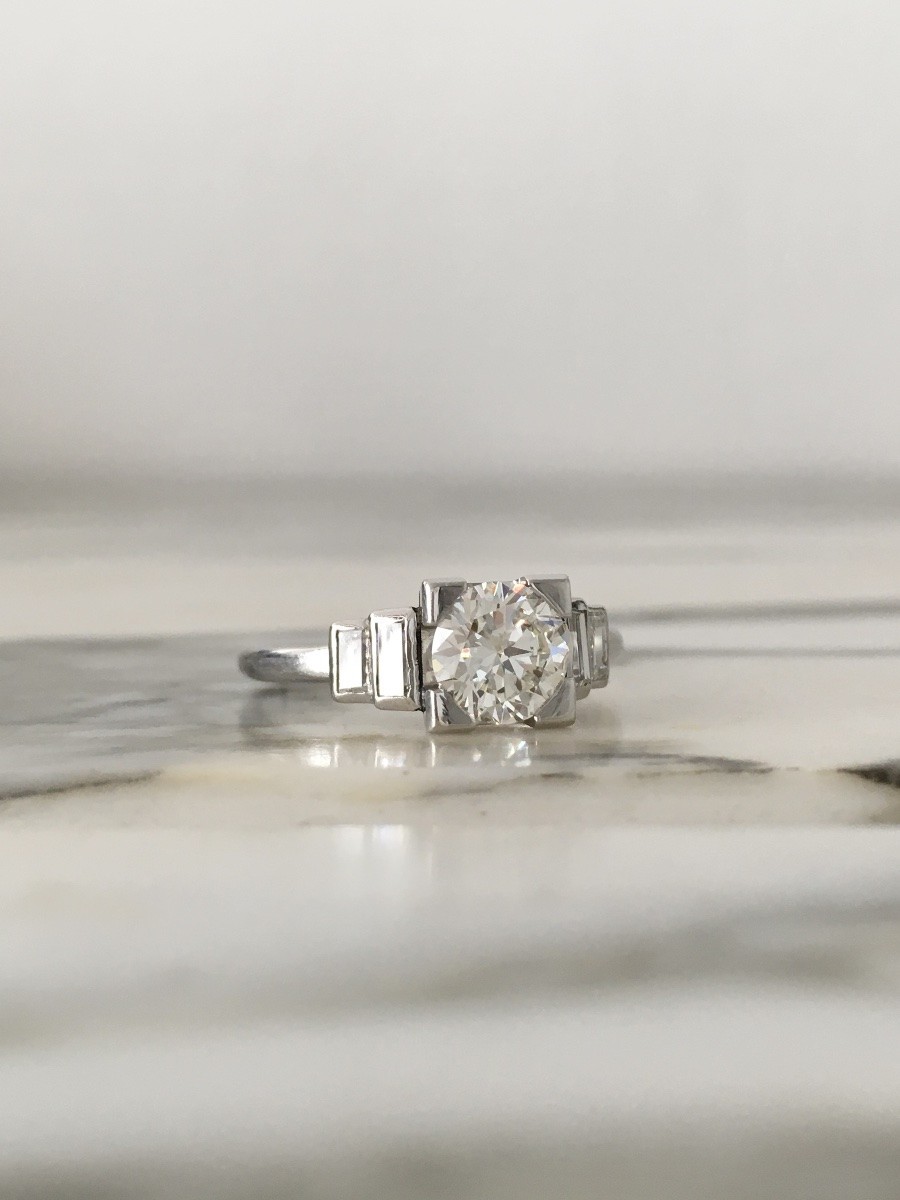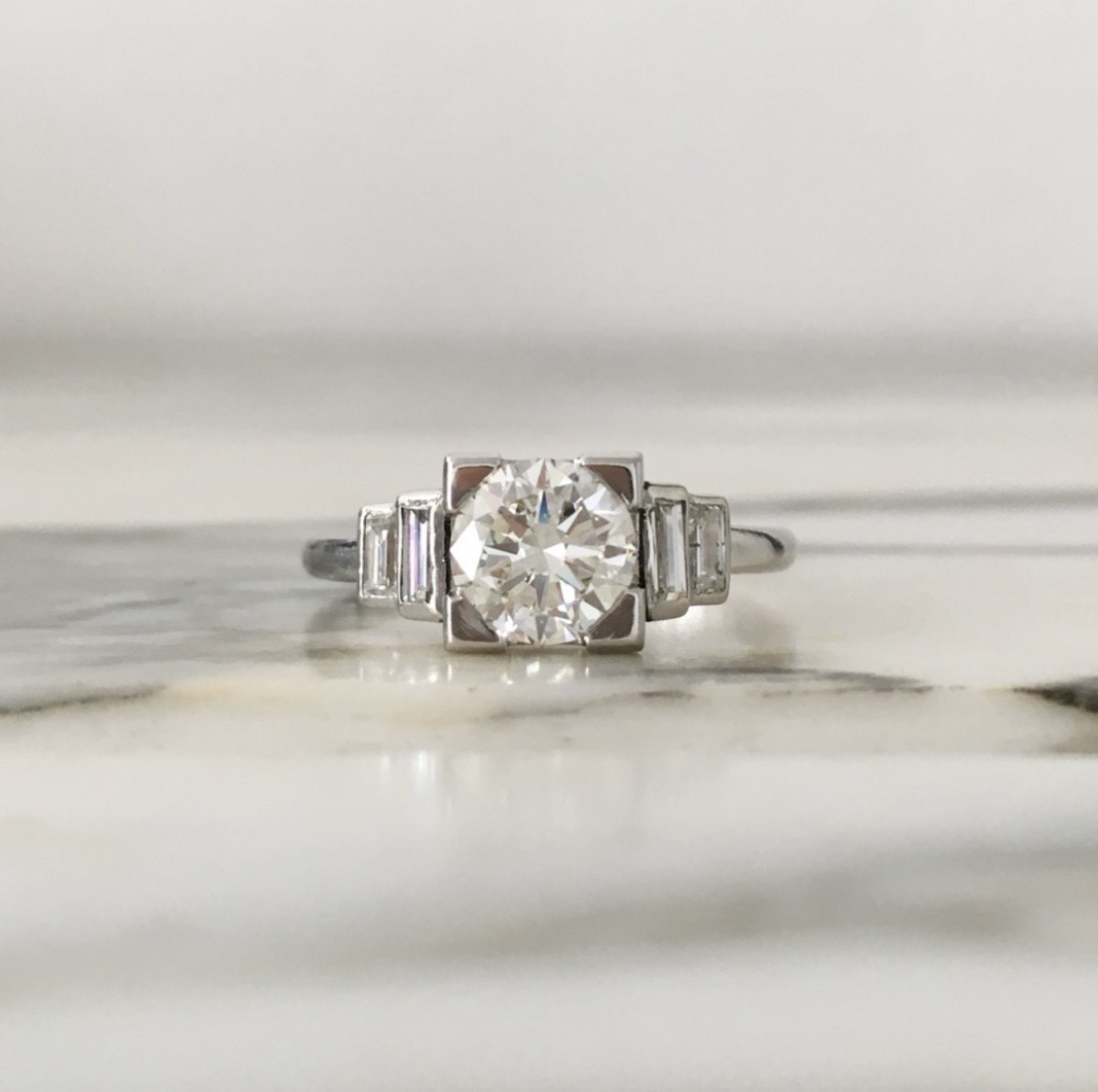 Bague Art Déco en platine centrée d’un diamant taille brillant pour environ 1,15 ct ( couleur H /pureté VVS ). Le diamant est épaulé de chaque côté de 2 diamants tailles baguettes pour un total d’environ 0,40 ct (couleur F-H /pureté VS-SI ).