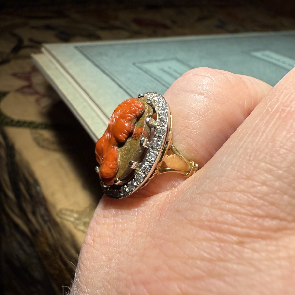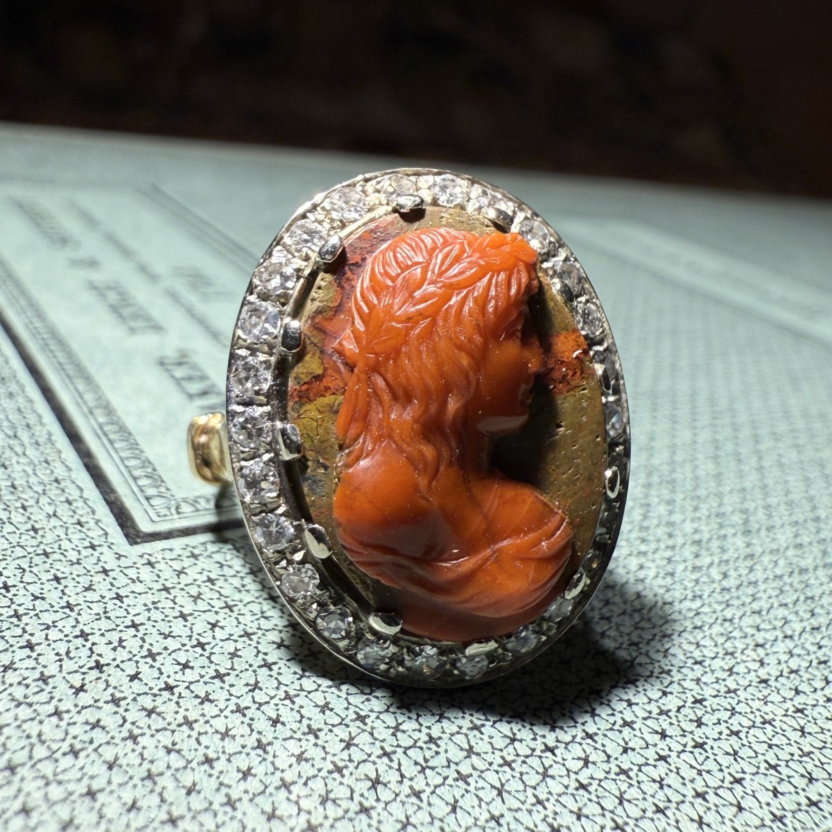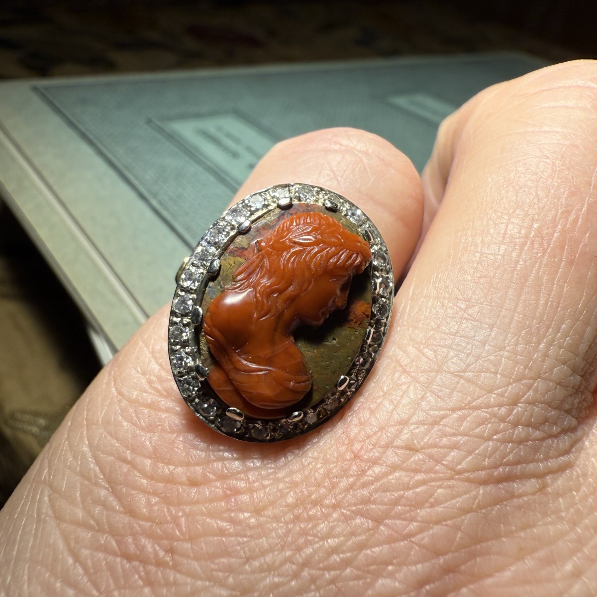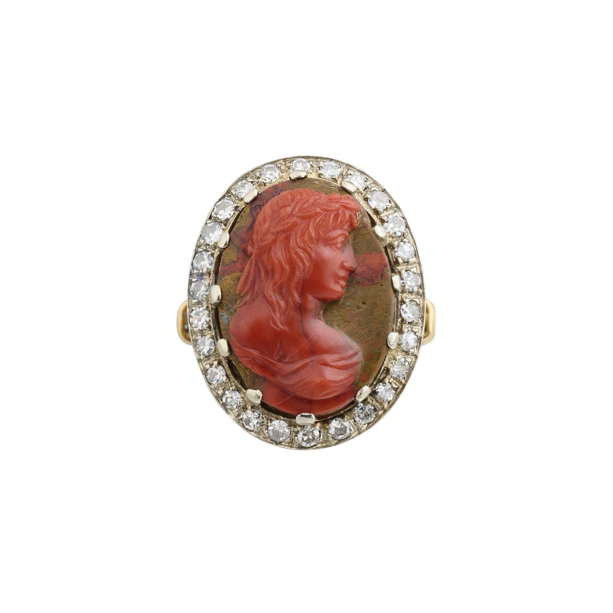 Le camée est cerclé d'une bordure de diamants taille simple sertis sur platine, formant un cadre net et lumineux qui accentue le contraste avec l'agate aux tons chauds. La monture en or de haut carat, datant de la fin du XIXe siècle, présente une structure ...
