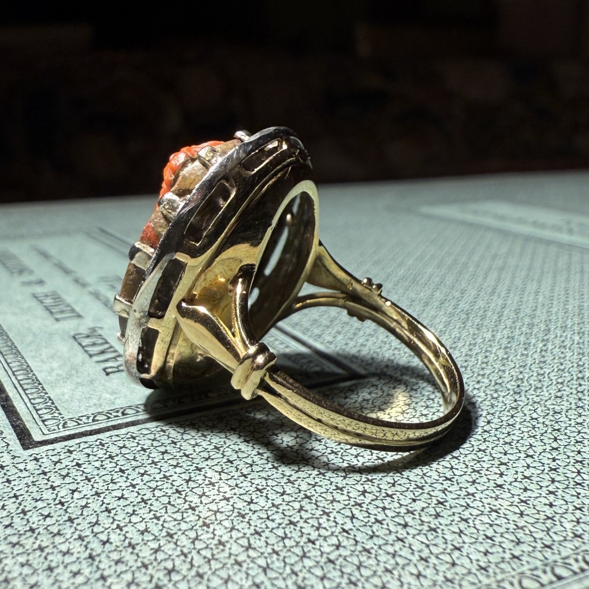 ... ajourée à l'arrière et des épaules bifurquées ornées de motifs de feuilles classiques, s'inscrivant ainsi dans le courant néoclassique alors en vogue dans la joaillerie anglaise. L'association d'une gravure italienne du XVIIIe siècle avec une monture anglaise plus récente témoigne d'une pratique courante au XIXe siècle, consistant à intégrer des pierres gravées anciennes dans des montures de conception nouvelle.