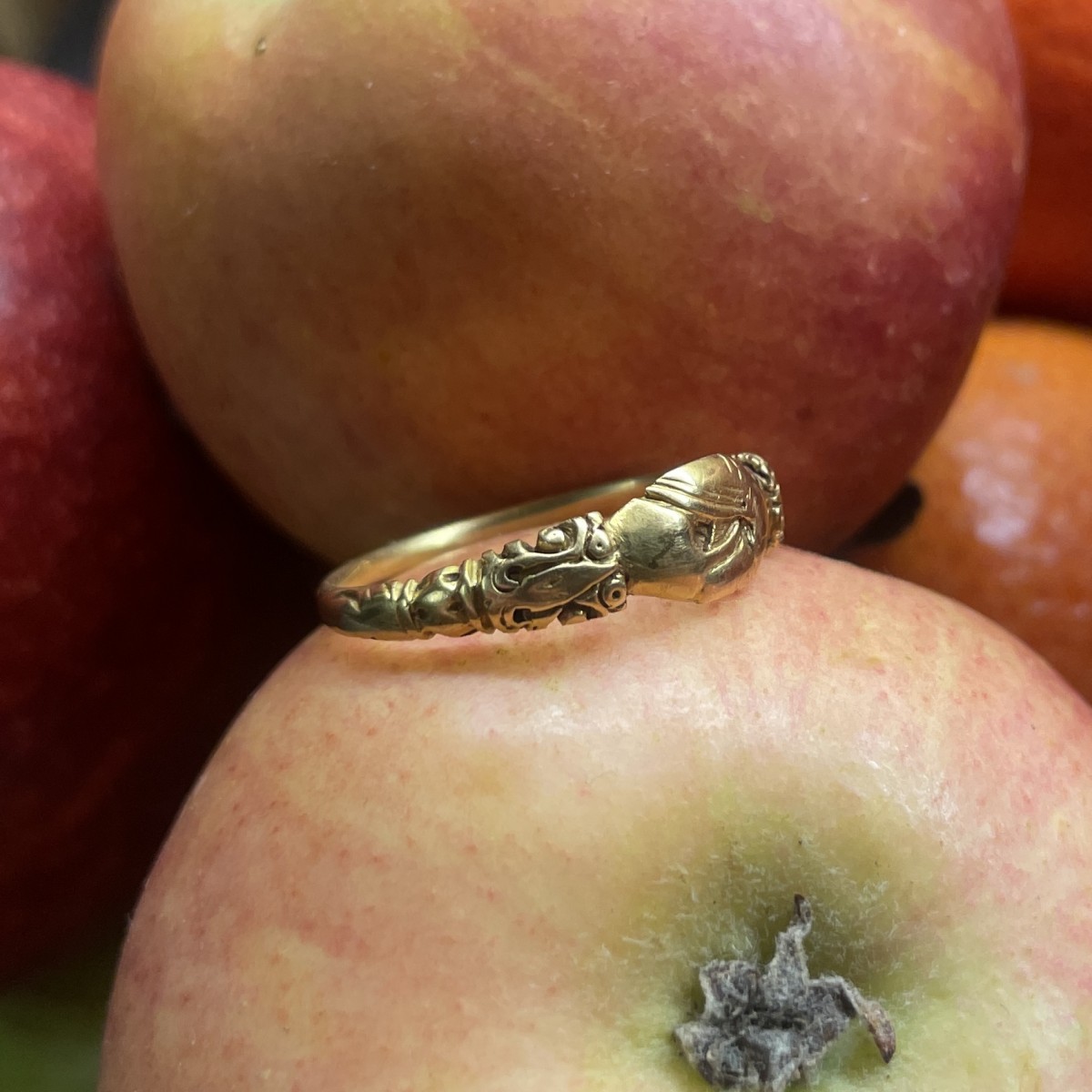 Cette bague présente l'ancien motif Fede de deux mains jointes, mais dans leur étreinte se trouve un cœur. Ces symboles représentaient l'amour et la fidélité. L'anneau était probablement un gage d'amour symbolisant une dévotion éternelle, ou peut-être une bague de fiançailles.
