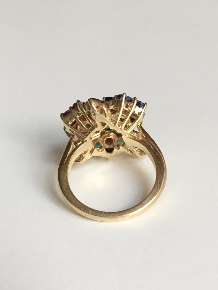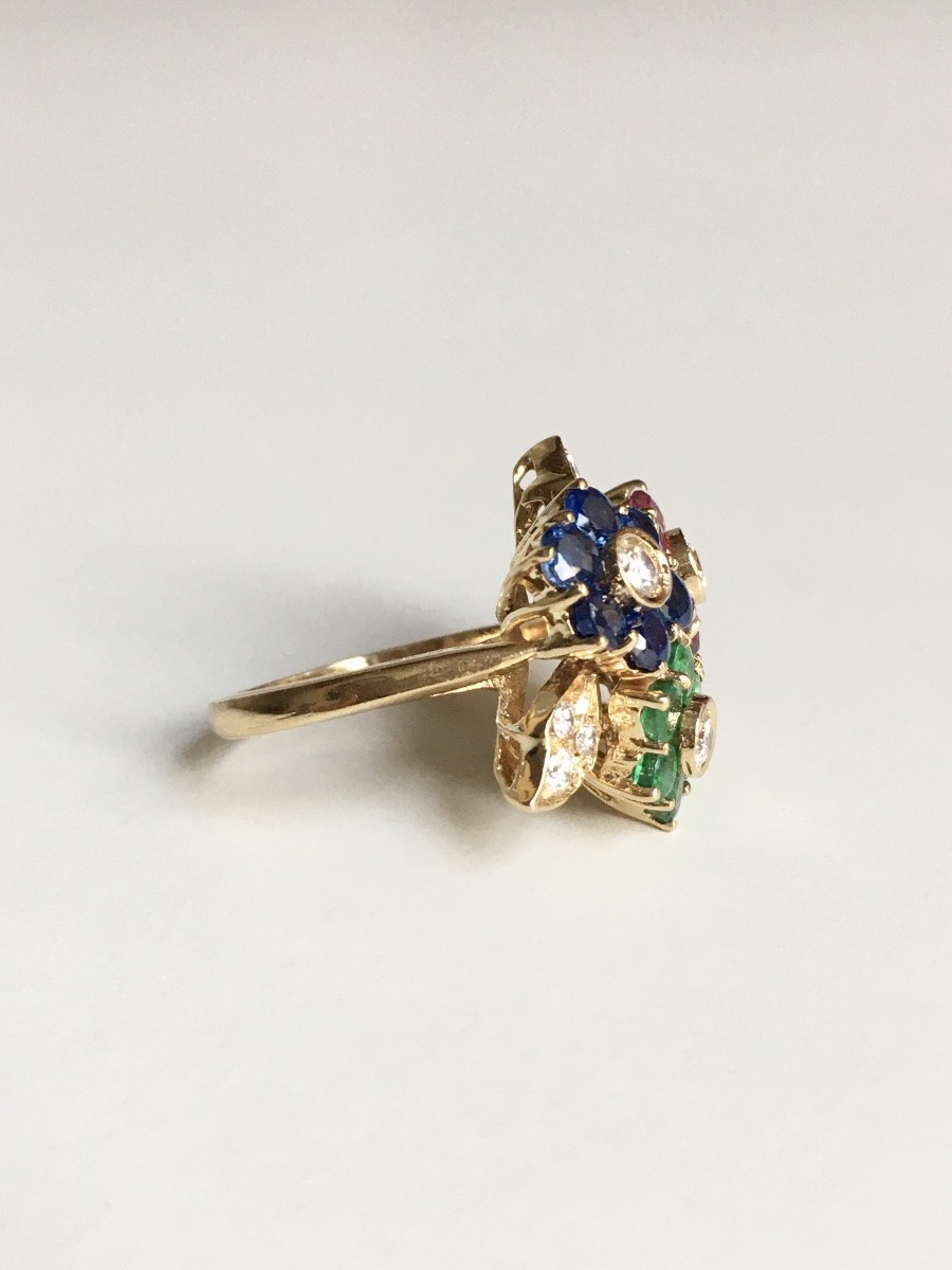 Bague en or jaune 18K ornée d’un motif floral composé de trois fleurs distinctes.