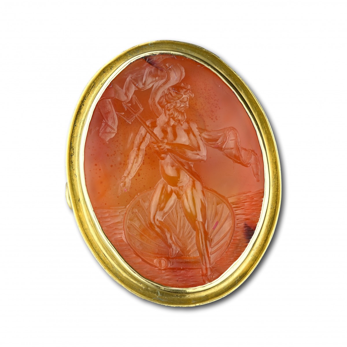 Une bague en or sertie d'une grande intaille en cornaline représentant Neptune, le dieu romain de la mer.