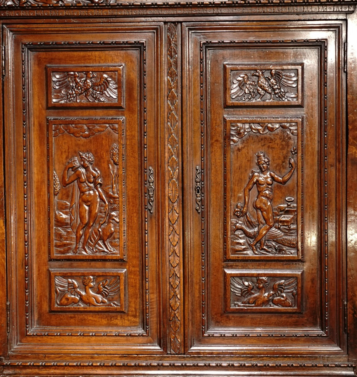 Sur les deux portes du corps du haut figurent les déesses Artémis/Diane (tenant un arc et accompagné d’un lévrier) et Héra/Junon (coiffée d’une couronne et accompagnée d’un paon)
