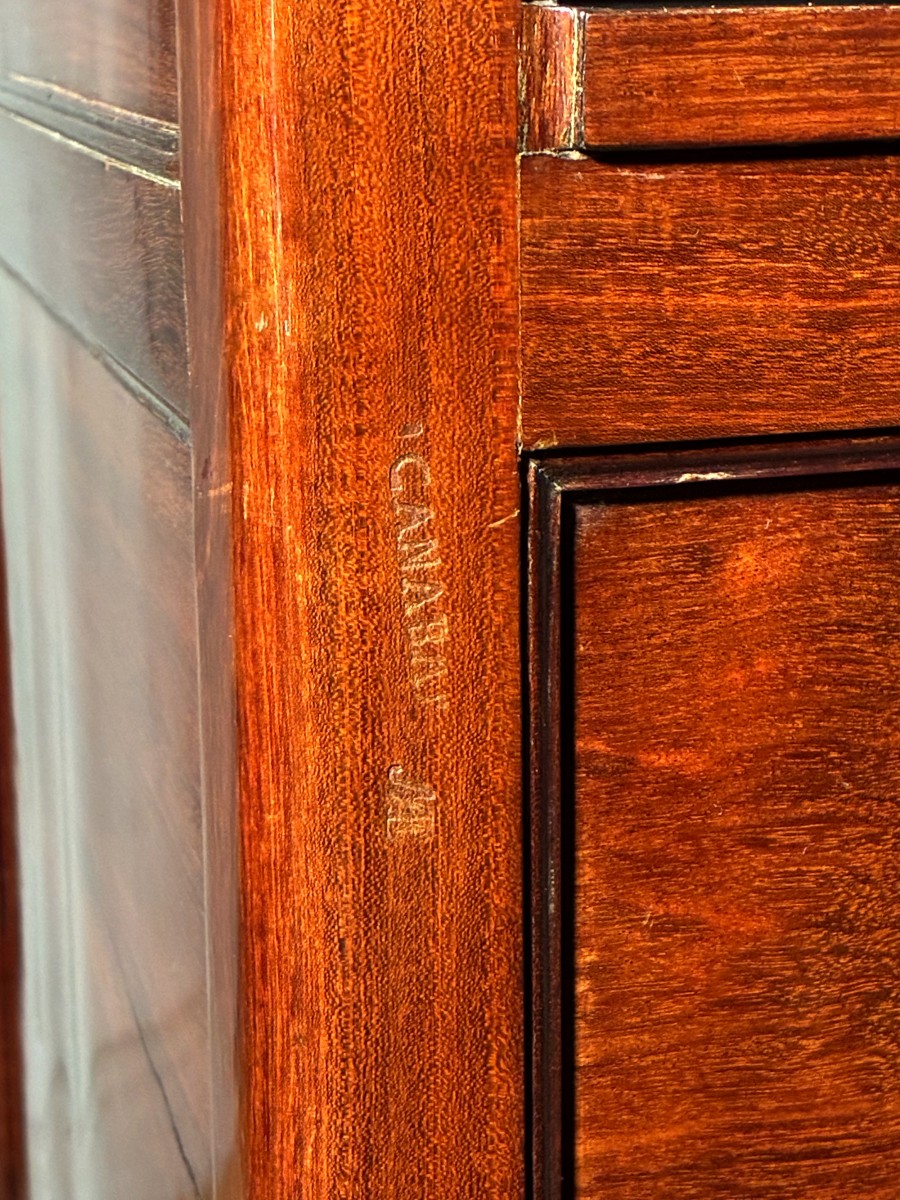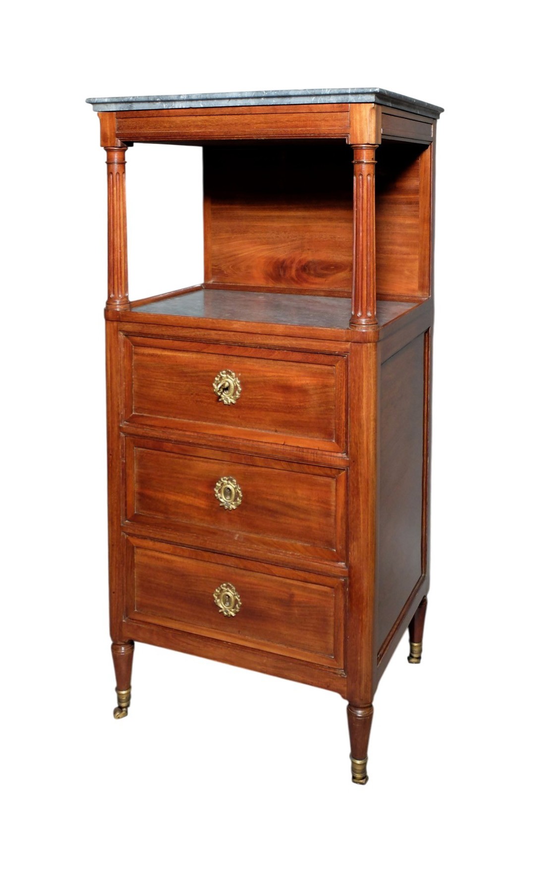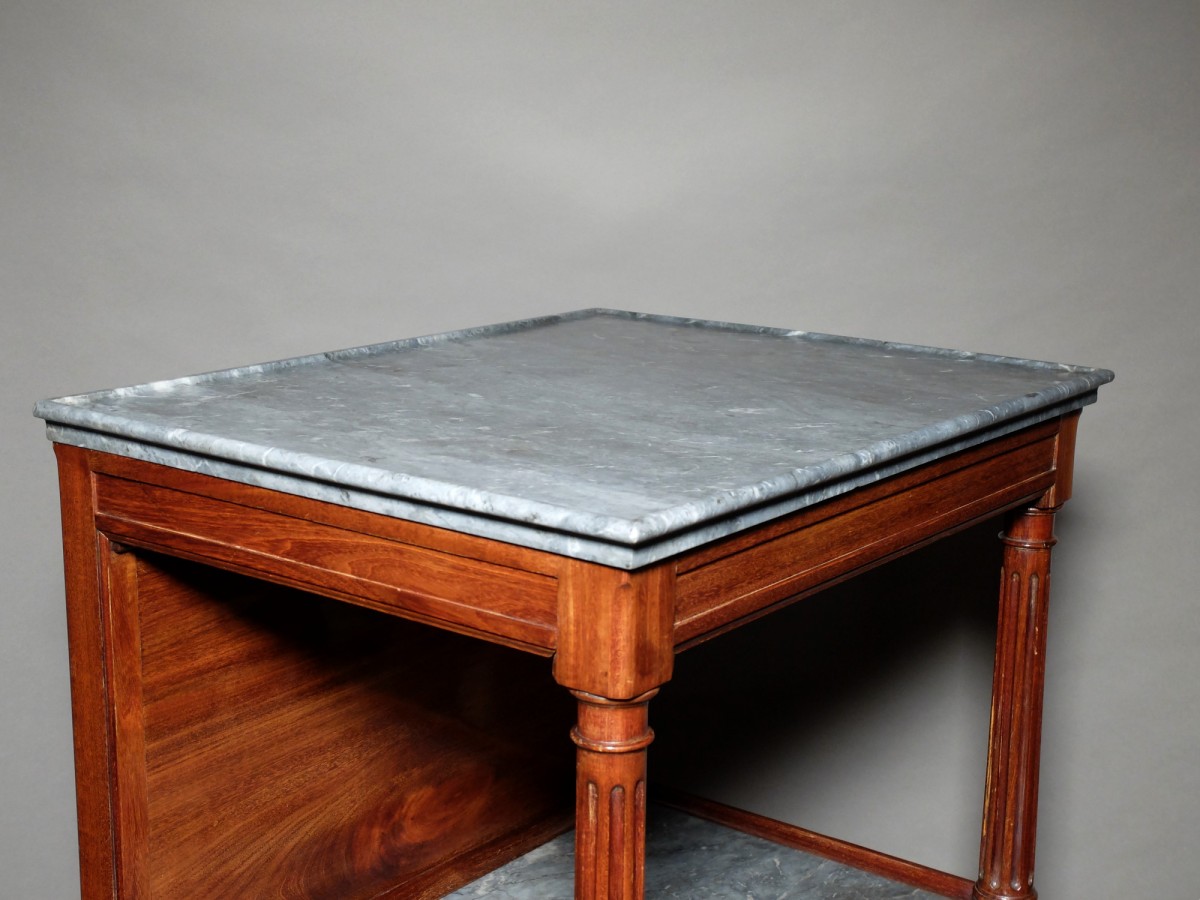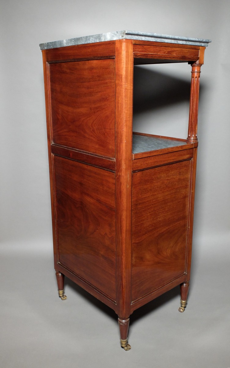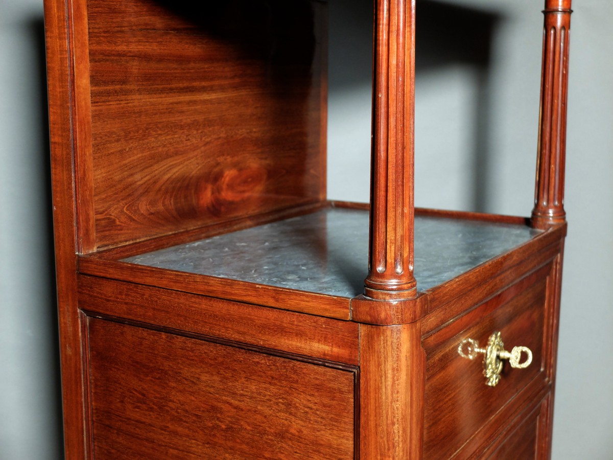 Au dessus de cette tablette de marbre, encadré de deux colonnes cannelées, un second marbre mouluré et creusé en cuvette glisse légèrement vers l'avant pour permettre de dégager un miroir monté sur crémaillère. De chaque côté de ce plateau de marbre ouvrent deux petits tiroirs dissimulés dans la mouluration de la ceinture.