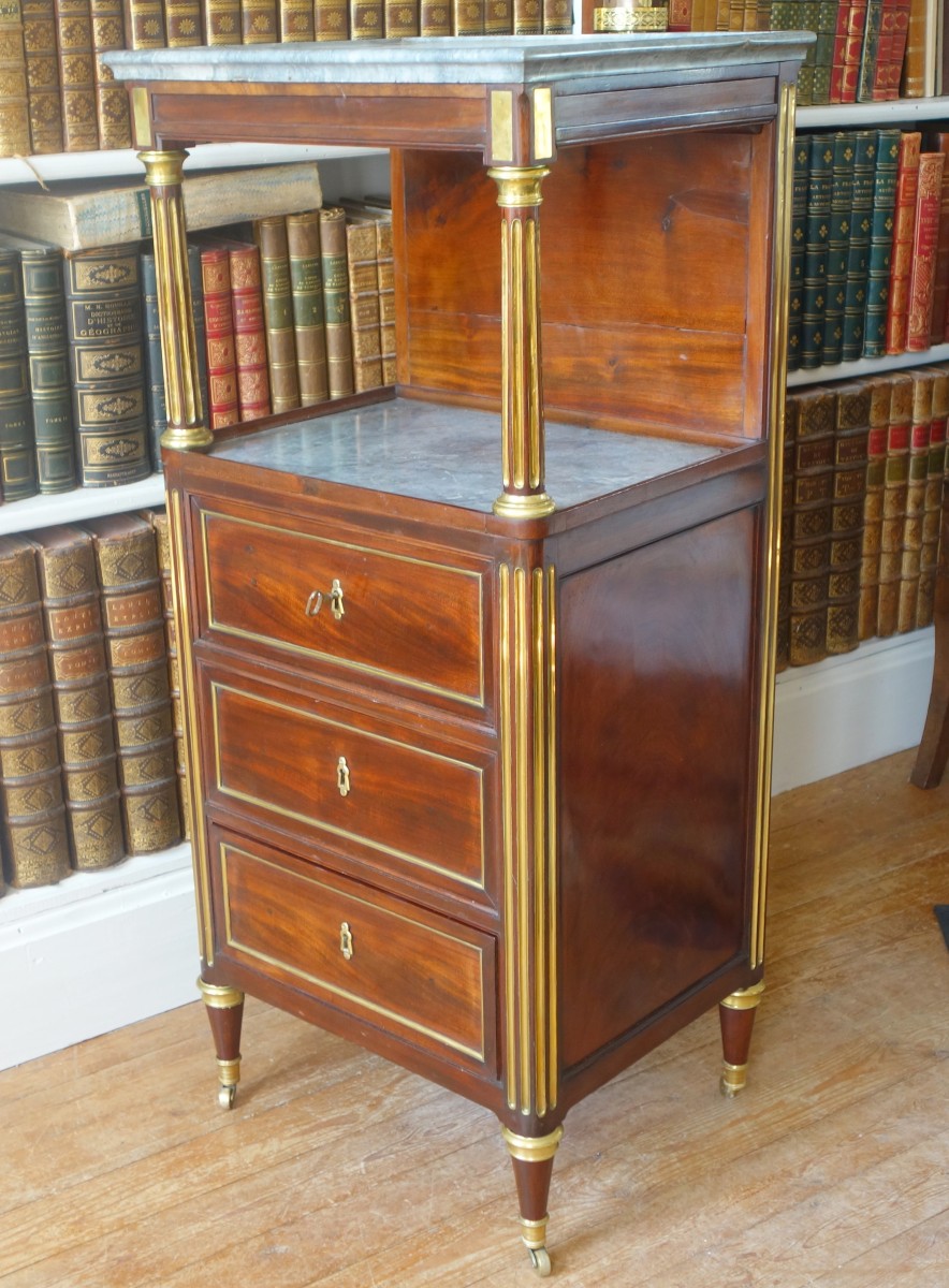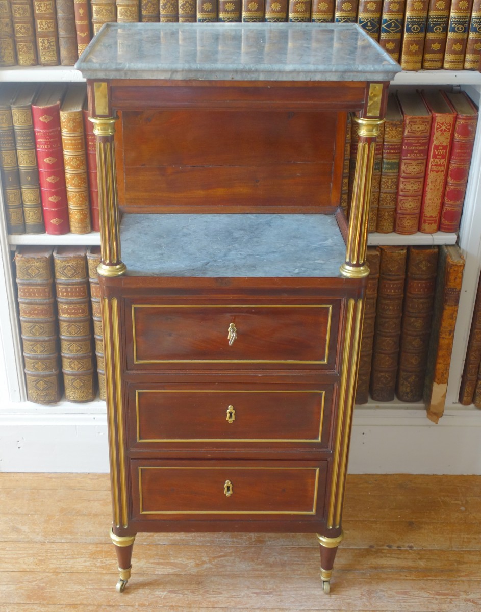 Élégante barbière en acajou et placage d'acajou, moulures et canelures en laiton. Posant sur quatre pieds fuselés à roulettes et ouvrant par trois tiroirs en façade, surmontés d'une niche à plateau de marbre bleu turquin encadrée de colonnes cannelées. Plateau cuvette de marbre bleu turquin qui coulisse pour laisser sortir le fond de miroir à glace au mercure coulissant à crémaillère. Un mince tiroir sur la droite pour ranger les rasoirs. Le meuble destiné à être placé au centre d'une pièce, est plaqué sur toutes les faces. Epoque Louis XVI Directoire, vers 1790-1800.