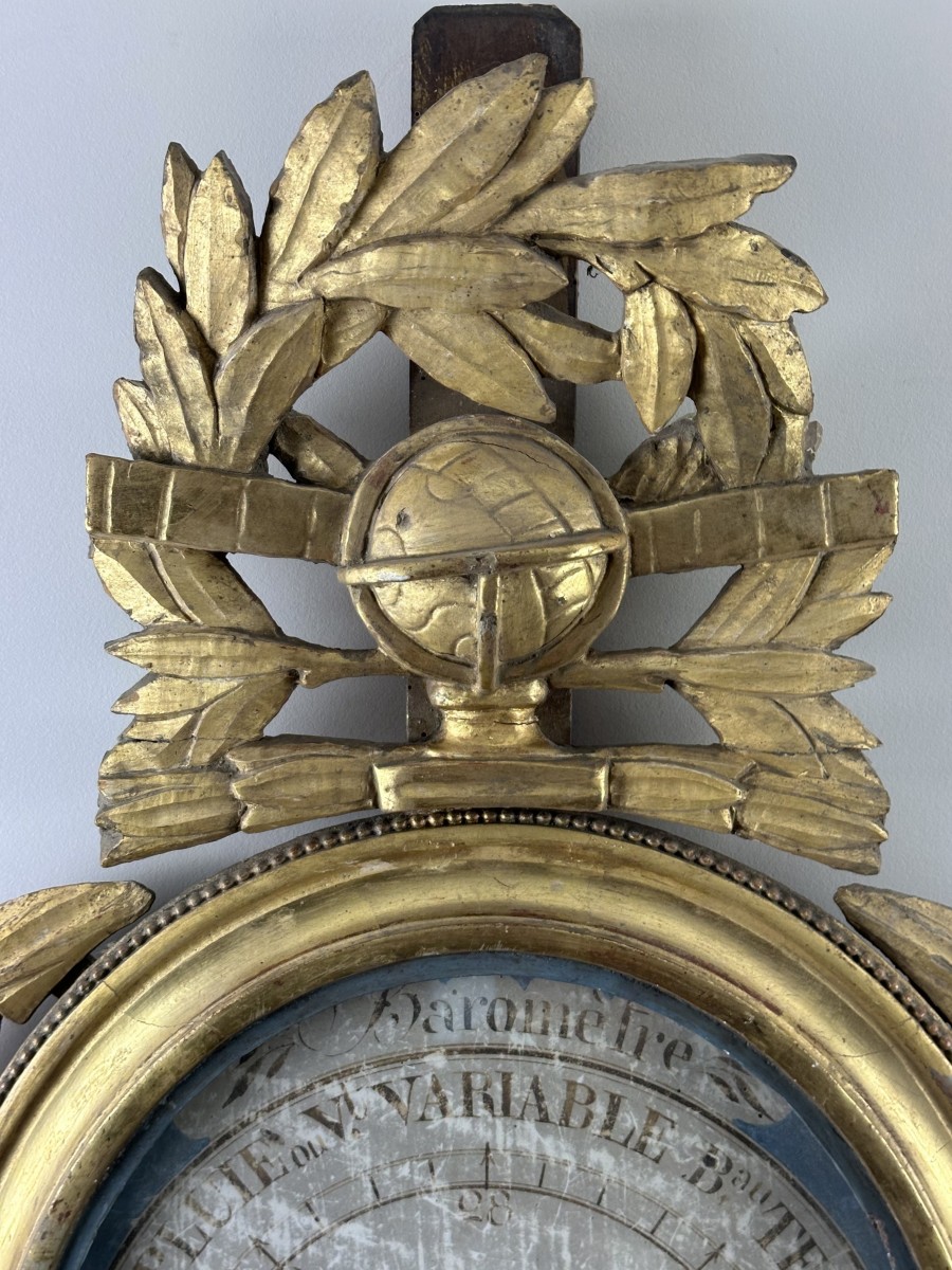 Baromètre aux attributs scientifiques, de pur style néo- classique, d’époque Louis XVI, du dernier quart du XVIIIe siècle, en bois de tilleul sculpté doré à la feuille traitée en bruni et amati. De forme médaillon surmonté d’un fronton, celui-ci est orné d’un fin travail de sculptures symétriques à claire-voie, d’objets scientifiques tels que globe terrestre et compas, couronnés d’un rameau d’olivier sur un tapis de feuillages et de fleurs. La partie en principale est constituée d’un cadre ovale à gorge et terrasse, bordé en périphérie de rais-de-cœur ; des guirlandes nouées de fleurs ornent symétriquement la base et son sommet, unifiant le fronton au cadre. Celui-ci abrite le baromètre à pression atmosphérique gradué selon Torricelli (1643) et de Pascal (1647). L'oculus indiquant les différents états de la barométrie sur fond bleu est légèrement altéré par le temps. Il est à noter que ce baromètre est orphelin de son tube coudé à ...