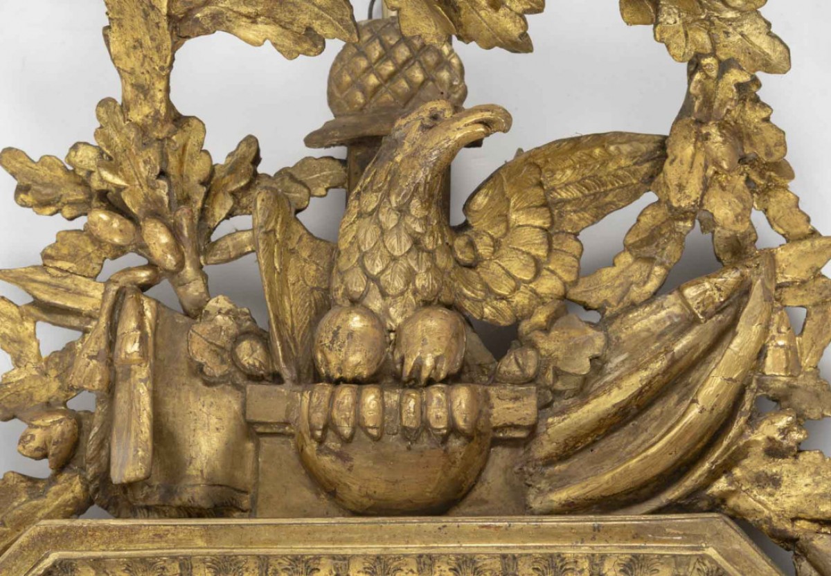 Orné d'un cadre en bois doré de forme octognale surmonté d'un fronton en bois doré et sculpté d'un aigle impérial sur un globe entouré d'une couronne de feuilles de chênes et de deux drapeaux.