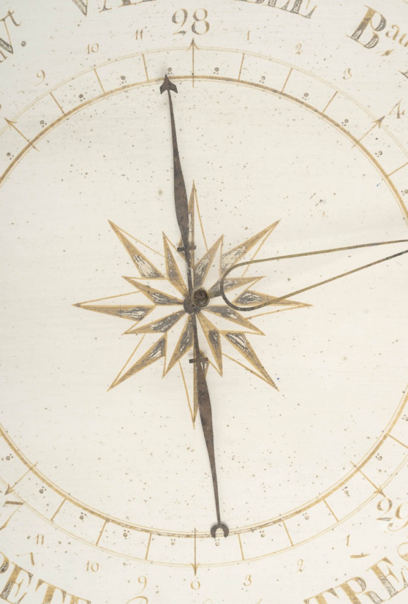 Le centre du baromètre servant à indiquer les variations du temps par les aiguilles se distingue sur un fond blanc qui se décline sur un fond de couleur bleu.