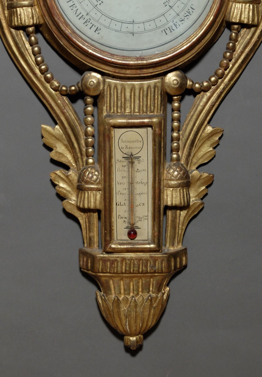 Baromètre-thermomètre en bois finement sculpté et doré. Au centre, un oculus permet la lecture par une aiguille et un index serpentin. Encadré de cornes d'abondances, il est sommé d'un couple de colombes, symbolisant l'Amour et de la fidélité, couronné de lauriers.