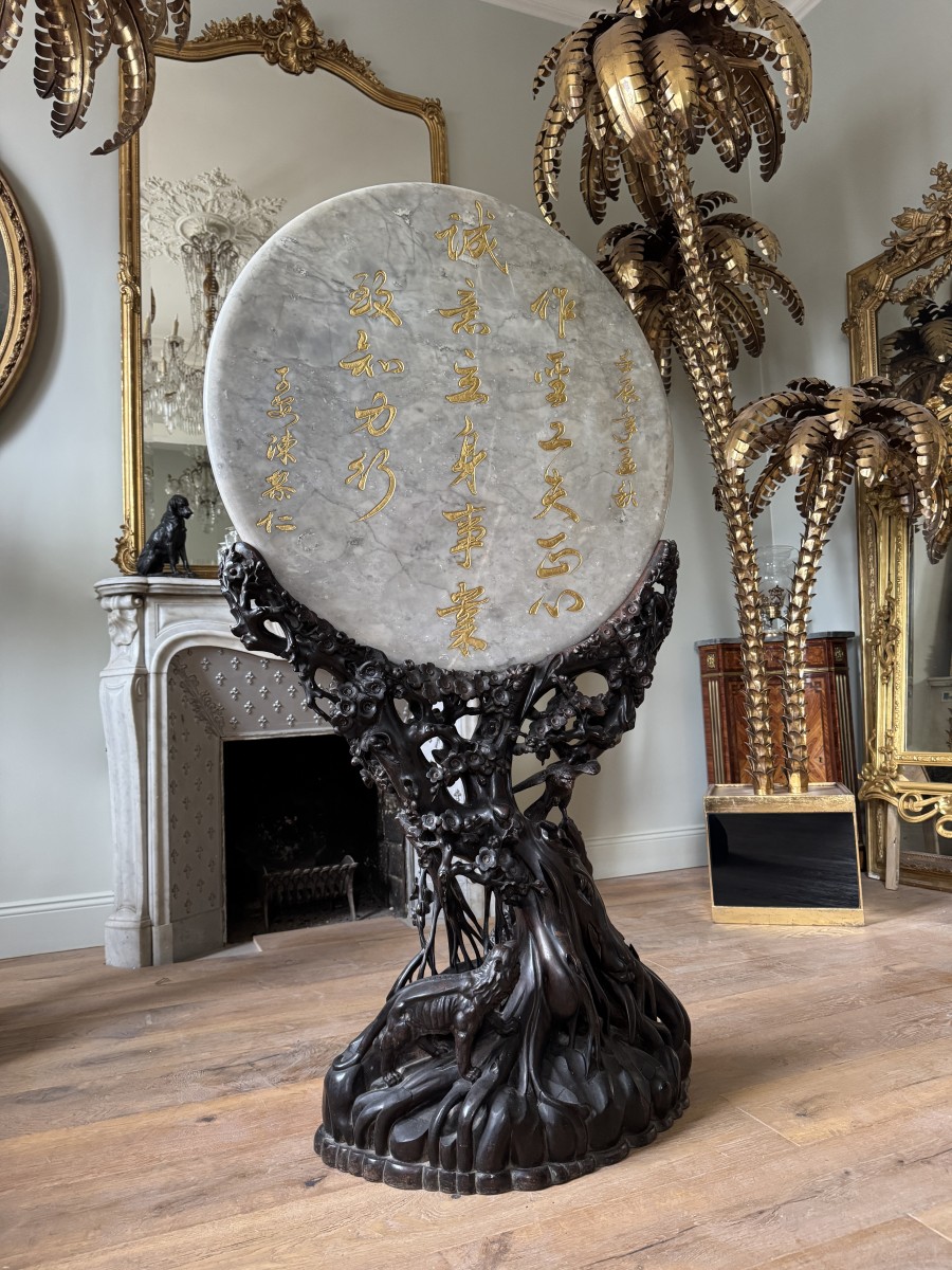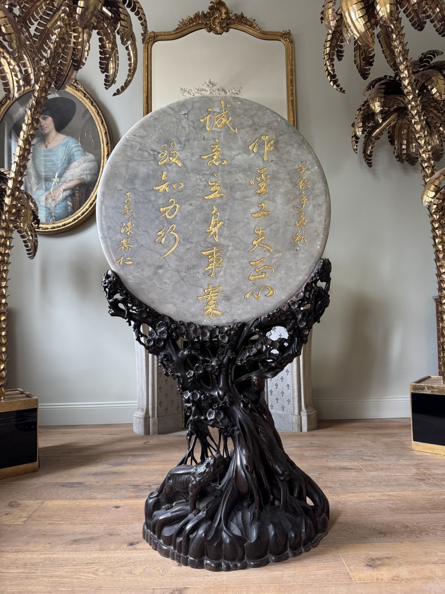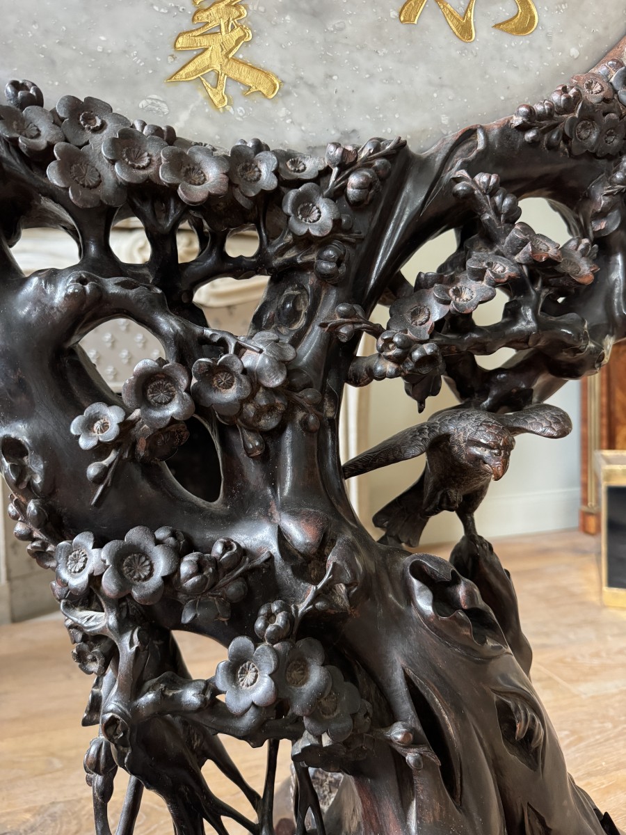 Grand écran de forme circulaire en marbre sur son piètement richement sculpté de crapauds, félins et volatiles