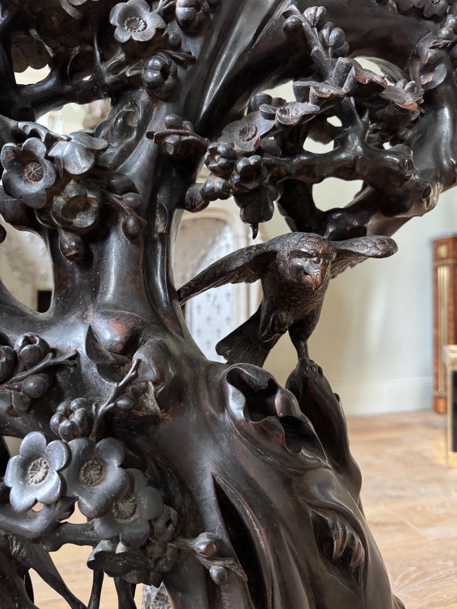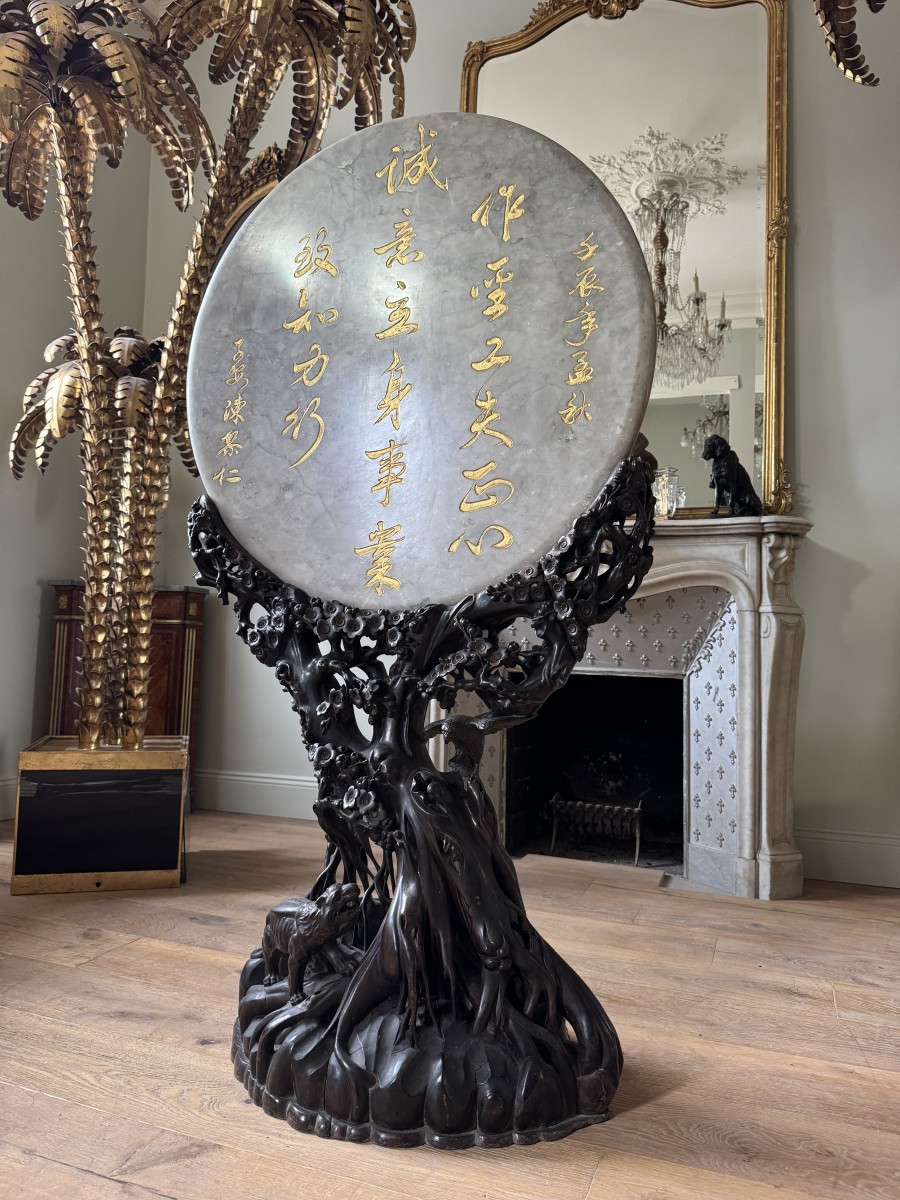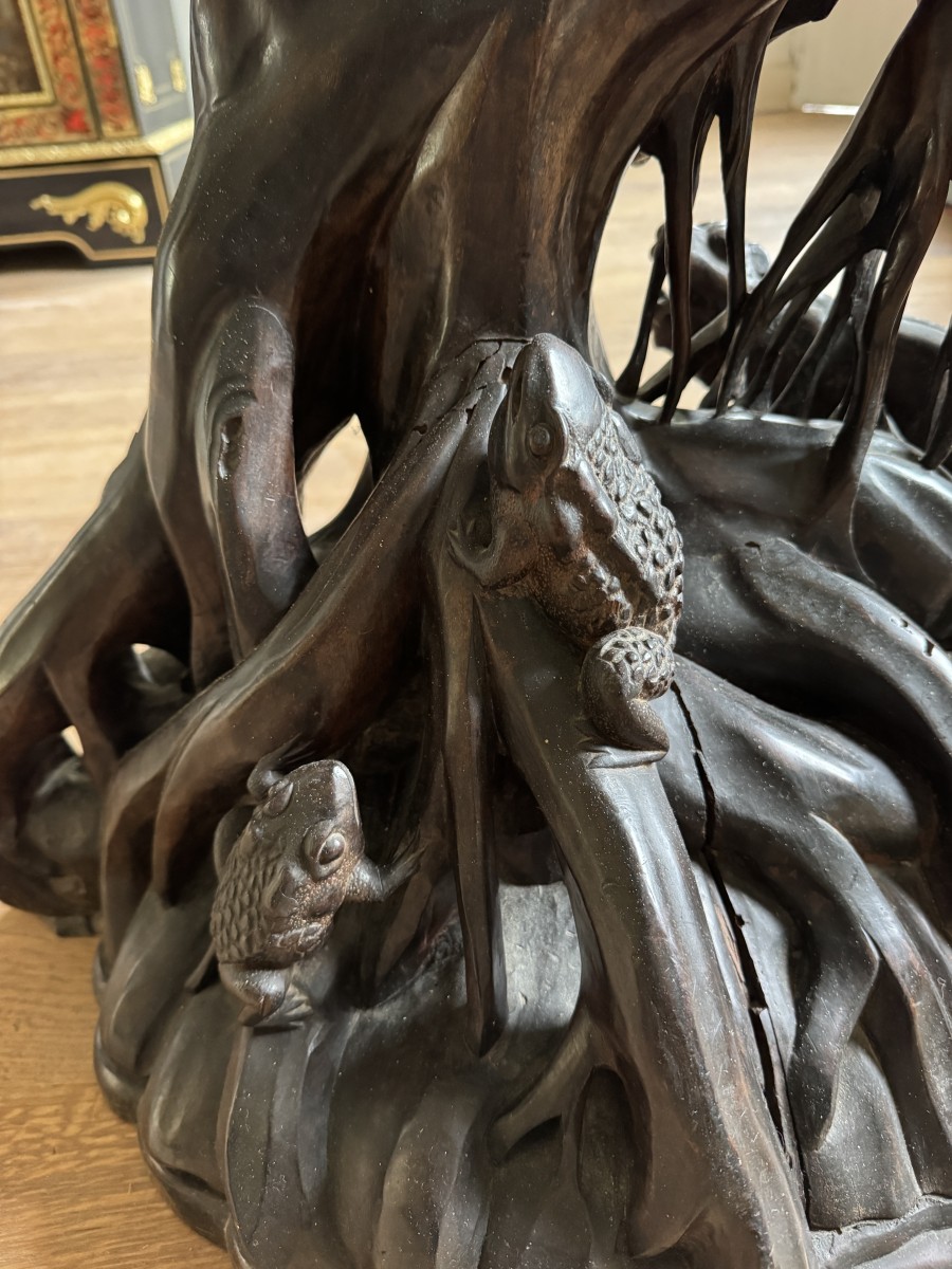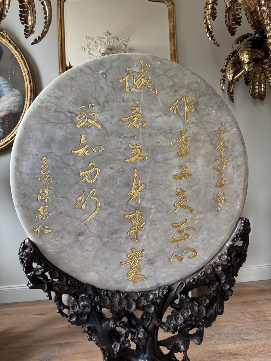 Grand écran de forme circulaire en marbre sur son piètement richement sculpté de crapauds, félins et volatiles