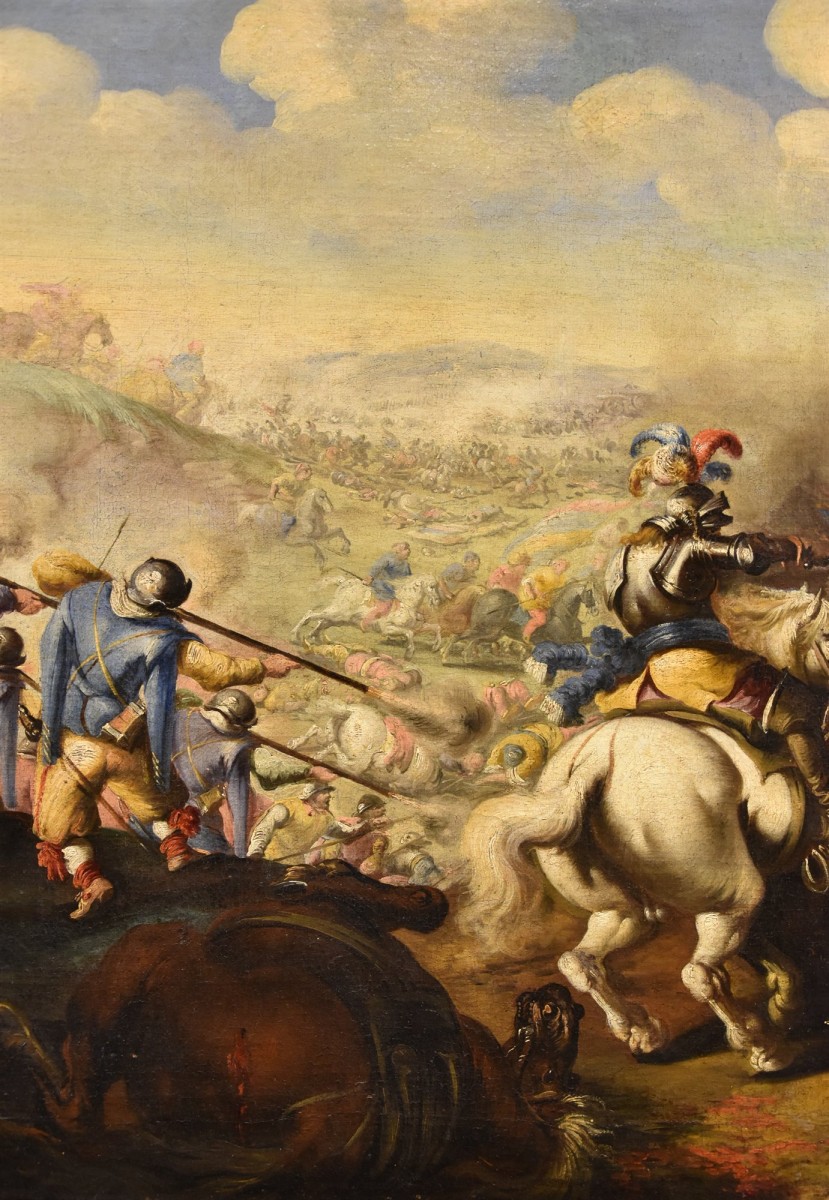 Retrouver le mobilier ou les objets d''art similaires à « Bataille entre les cavaleries chrétienne et turque » présenté par Antichità Castelbarco, antiquaire à Riva del Garda dans la catégorie Tableaux XVIIe siècle Louis XIV, Tableaux et dessins.