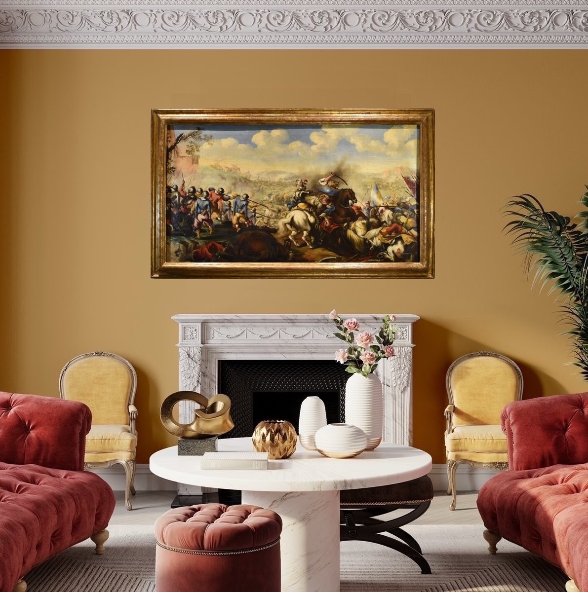La toile, en particulier, renvoie aux résultats picturaux de la production artistique de Marzio Masturzo, représentant emblématique du genre des « peintres de batailles » italiens du XVIIe siècle, actif à Naples puis à Rome dans la seconde moitié du XVIIe siècle.