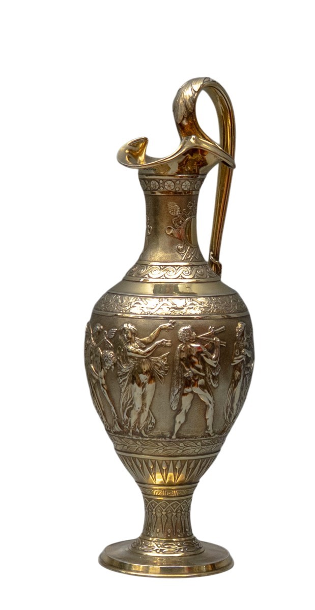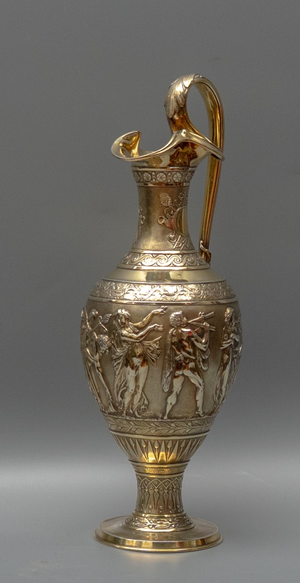 L'aiguière est de forme oenochoé classique, élevée sur un pied circulaire à gradins avec une tige effilée, le corps surmonté d'un long col à lèvre trilobée et d'une anse sinueuse en forme de serpent, enrichie de feuilles d'acanthe à son terminal supérieur et de feuilles de vigne appliquées à sa jonction inférieure. Le col est articulé par une frise de rosettes en partie haute et une frise en volute vitruvienne en partie basse, entre lesquelles apparaissent des cartouches en médaillon noués de rubans, disposés contre des trophées bachiques — un thyrse, des flûtes et des instruments de musique.