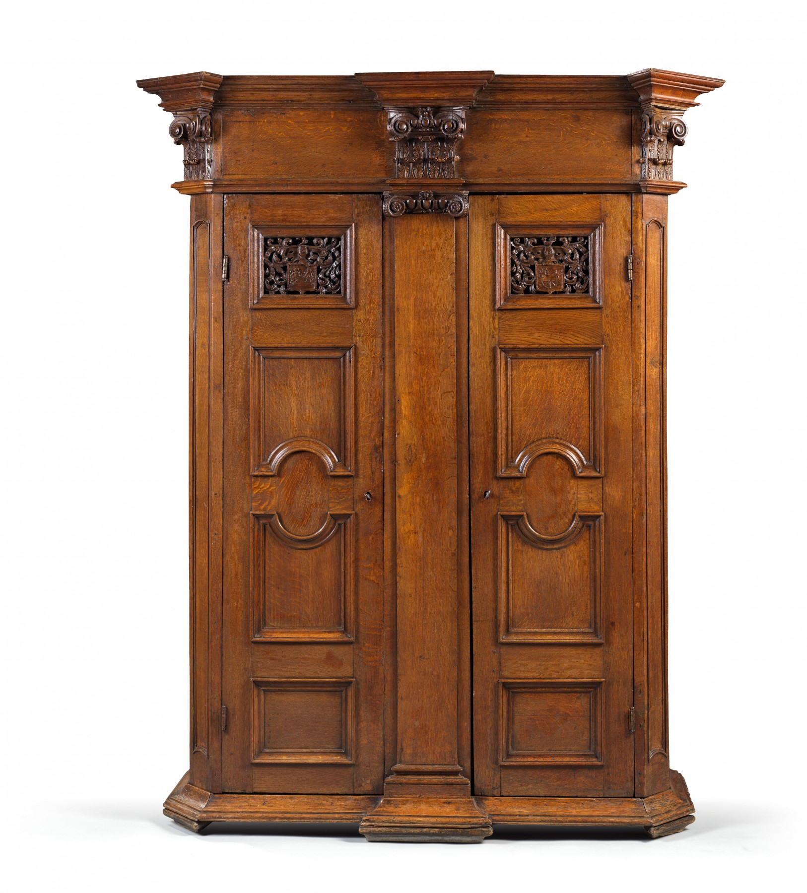Les panneaux supérieurs sculptés à orbevoie présentent sur un lit de feuillage bordé par un ruban, deux blasons différents surmontés d’un heaume qui témoignent que ce meuble est sans aucun doute un meuble de mariage.