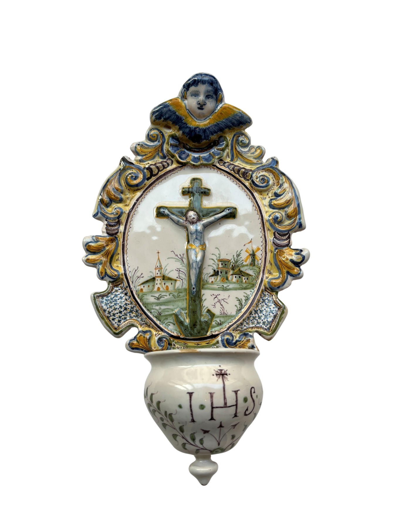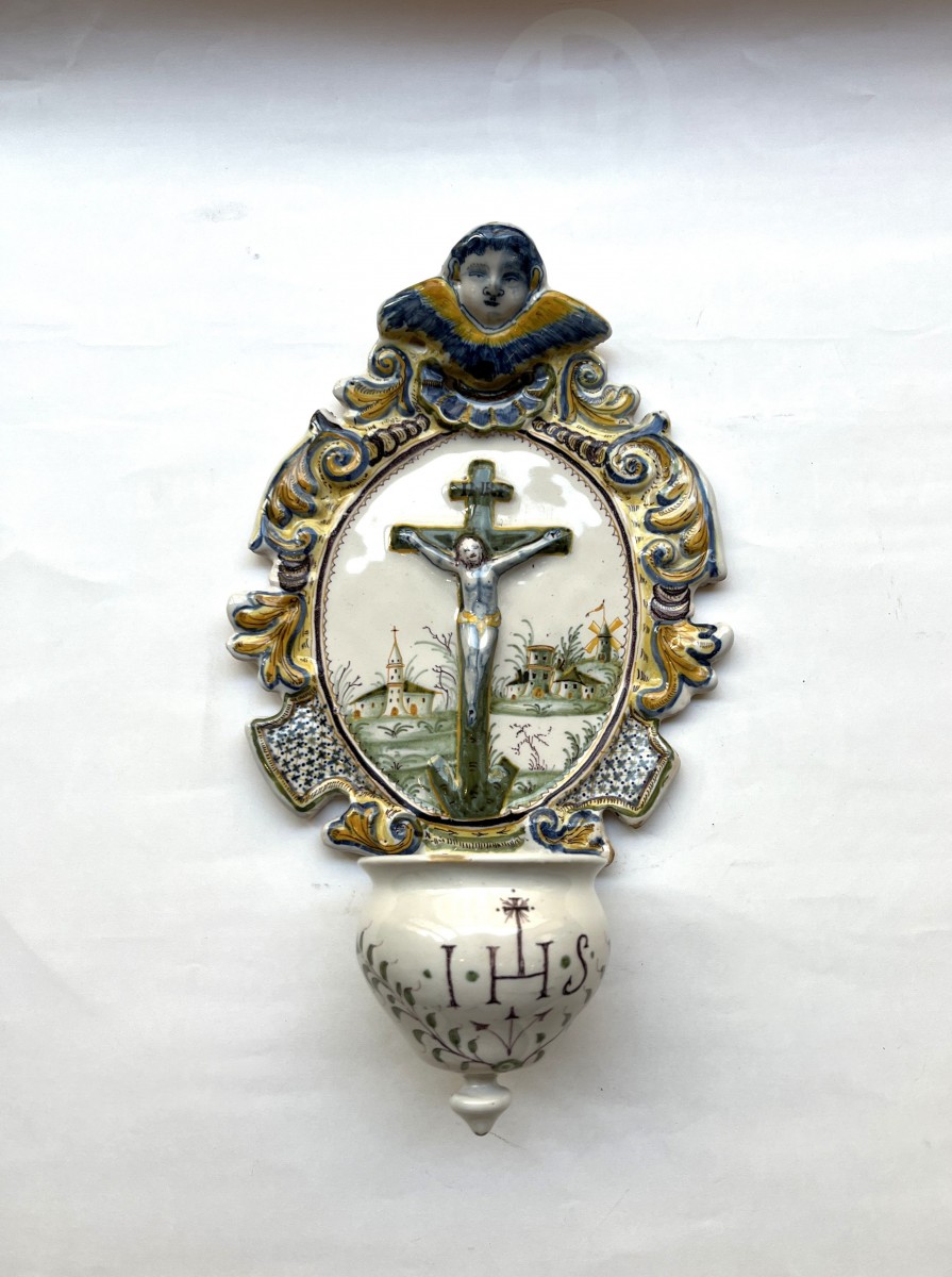 Bénitier à bord découpé et surmonté d'une tête d'angelot en faïence de Varages à décor polychrome, dans un cadre rocaille composé de volutes et rinceaux en relief, du christ en relief sur la croix surmonté de l'inscription "INRI", entouré d'un paysage avec une église à gauche et d'un village fortifié avec un moulin à droite ; godet portant l'inscription "IHS" entourée de tiges feuillagées.