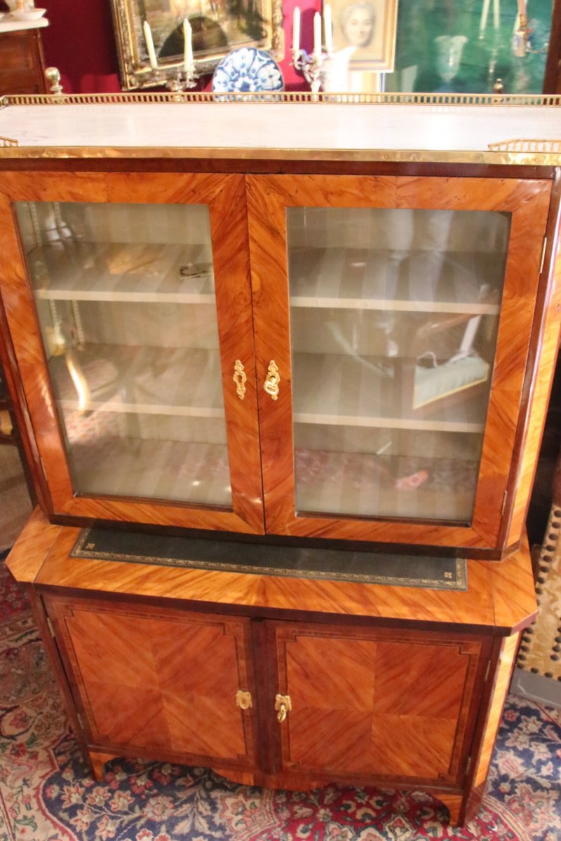 Petite et élégante bibliothèque en bois de rose ouvrant par quatre vantaux, dont ceux de la partie supérieure sont vitrés. En son milieu un plateau coulissant est intégré permettant de pouvoir la transformer en bureau . La partie supérieure est pourvue d' une galerie en bronze ajourée et d' un marbre blanc de Sainte- Anne. Les entrées de serrures ainsi que les clés sont d'origines.
