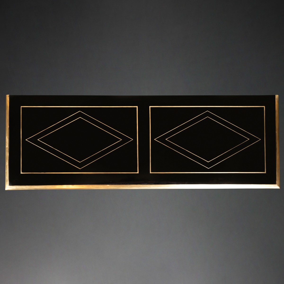 Ornements de filets de laiton à décor géométrique sur le plateau et les côtés.