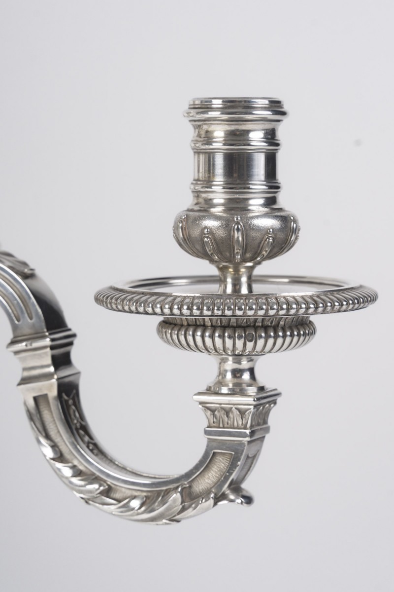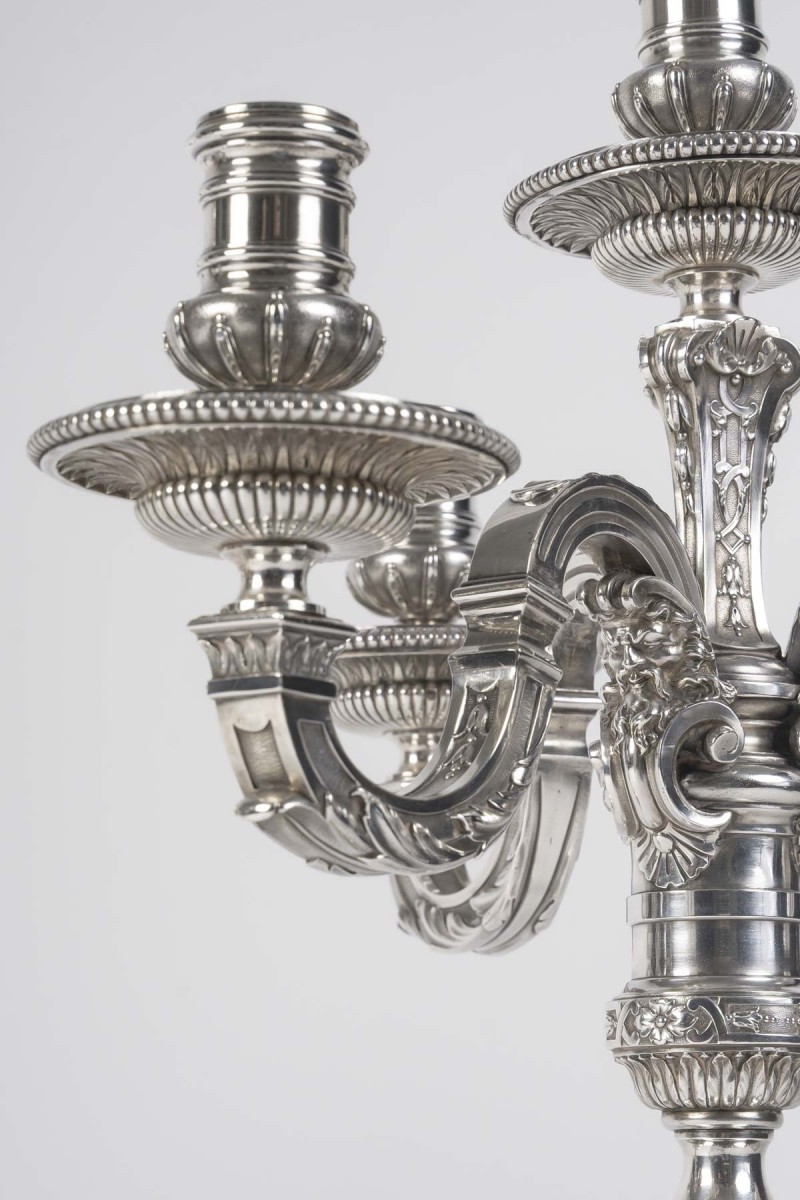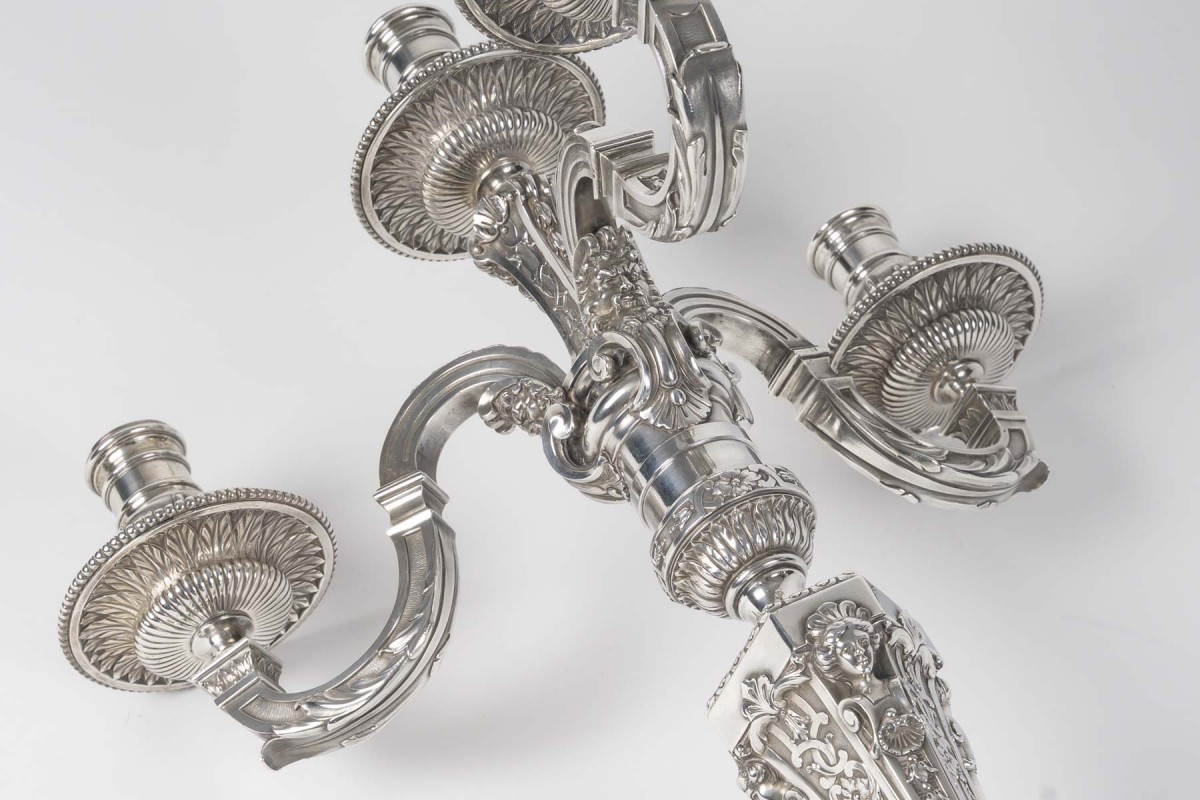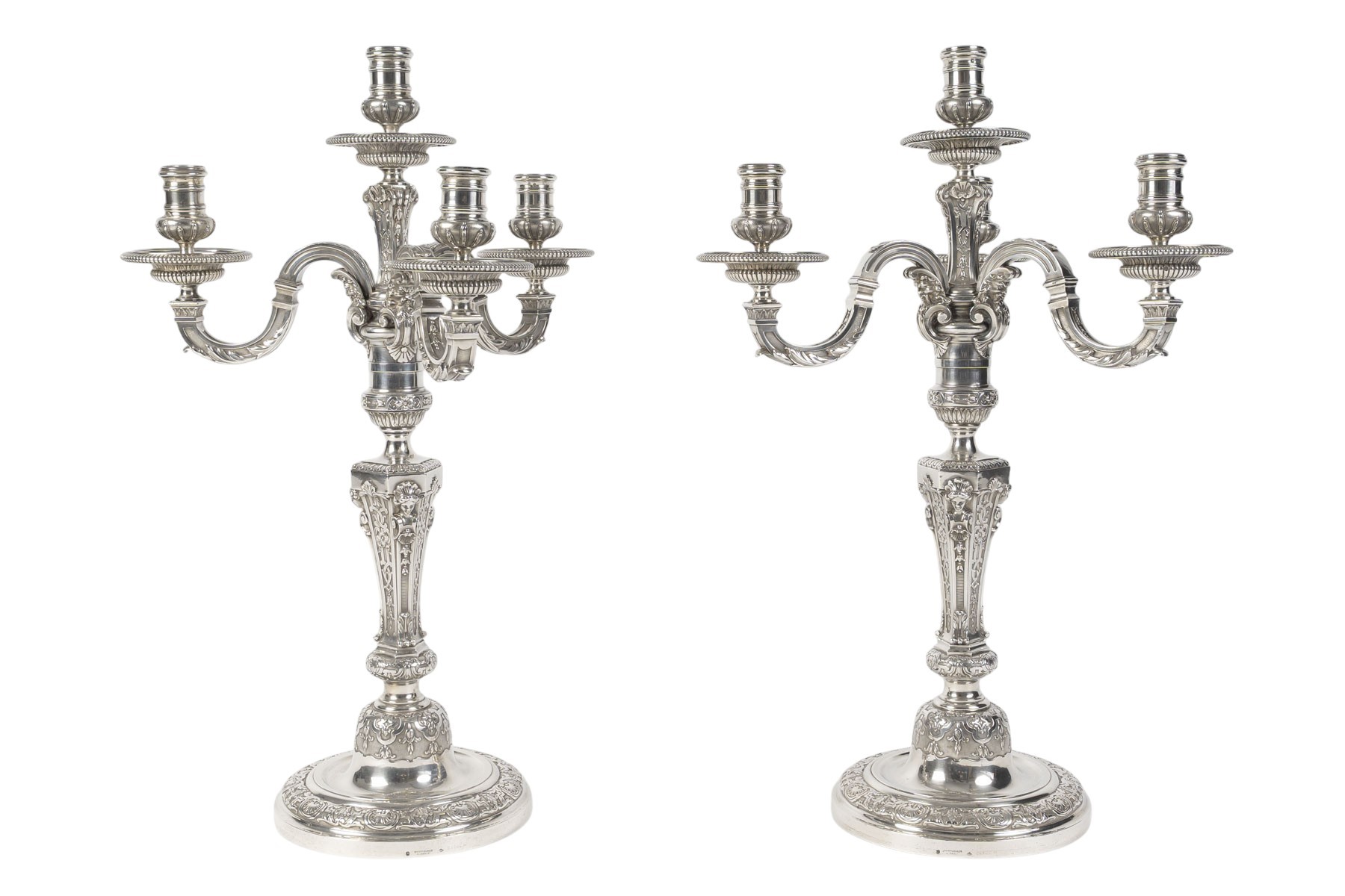Importante paire de candélabres d’apparat en argent massif à trois bras de lumière plus une centrale. D’une silhouette élancée et majestueuse, chaque candélabre repose sur une base circulaire richement moulurée supportant une haute tige à pans, entièrement ciselée de rinceaux, de cartouches et de motifs néoclassiques.
