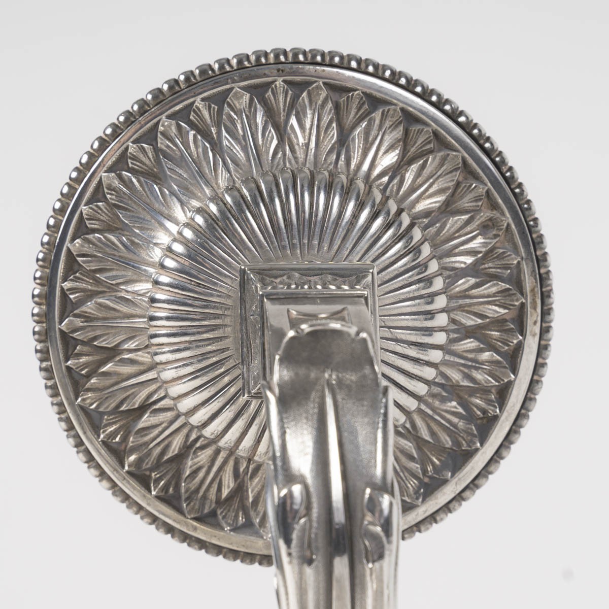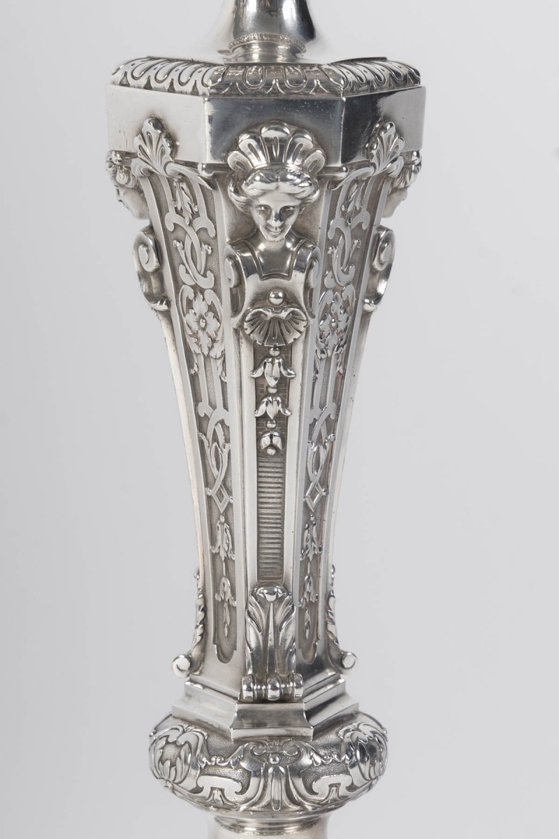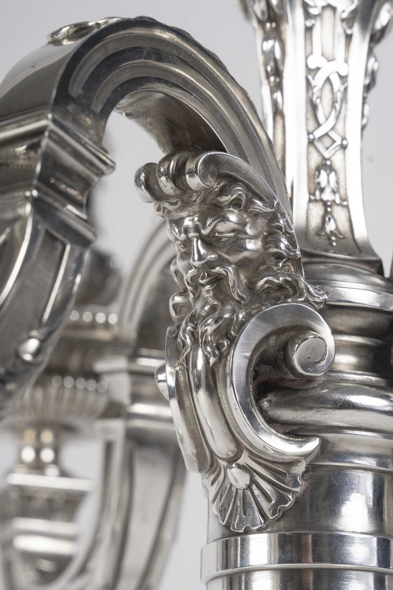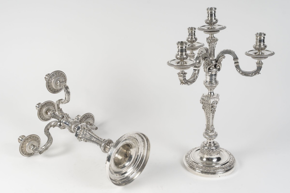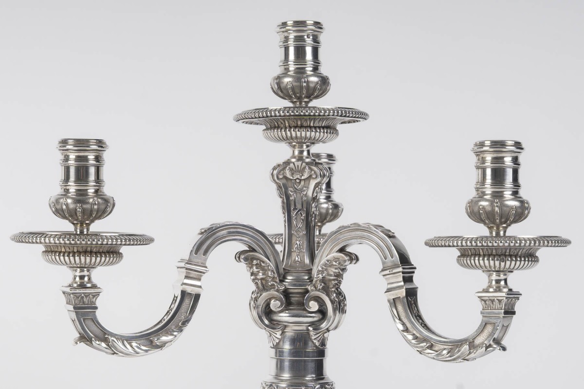Importante paire de candélabres d’apparat en argent massif à trois bras de lumière plus une centrale. D’une silhouette élancée et majestueuse, chaque candélabre repose sur une base circulaire richement moulurée supportant une haute tige à pans, entièrement ciselée de rinceaux, de cartouches et de motifs néoclassiques.