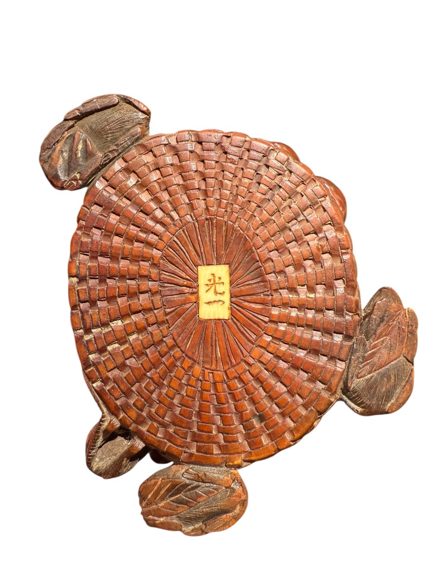 Sur la base, une petite plaquette incrustée d’ivoire ou d’os porte la signature ? (Mitsu / K?), gravée à la main.