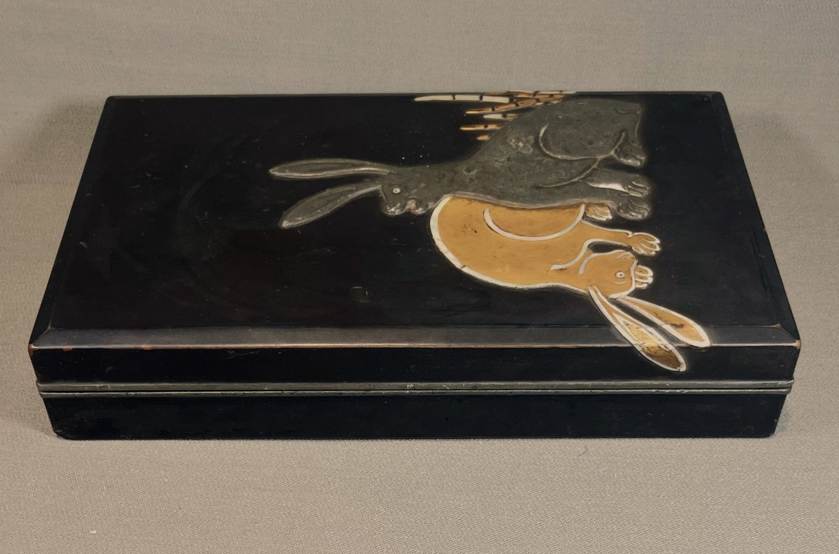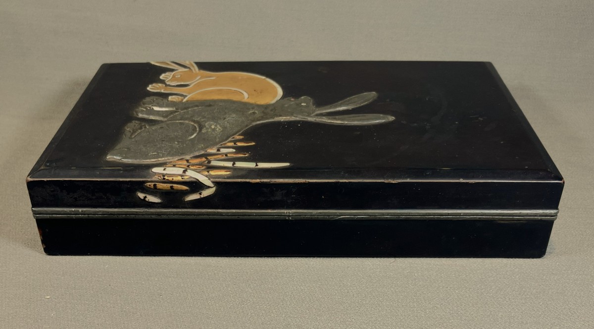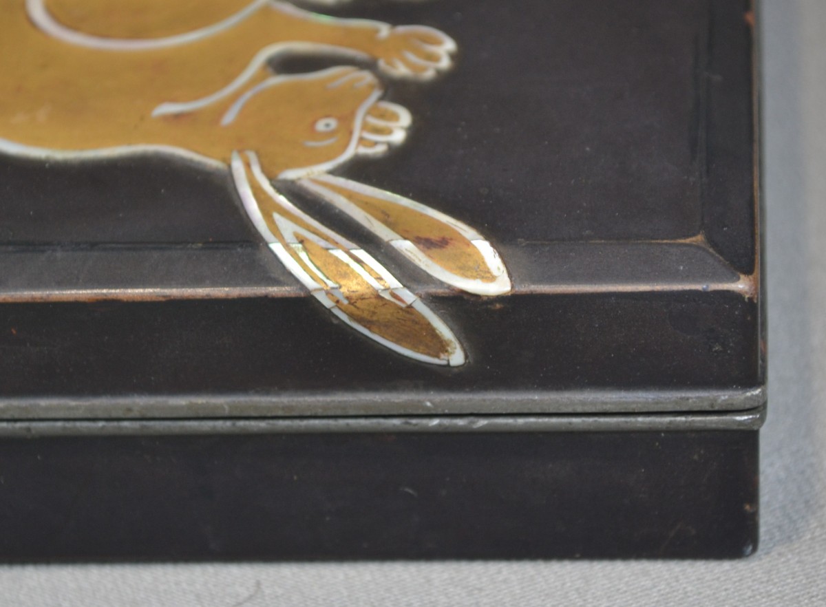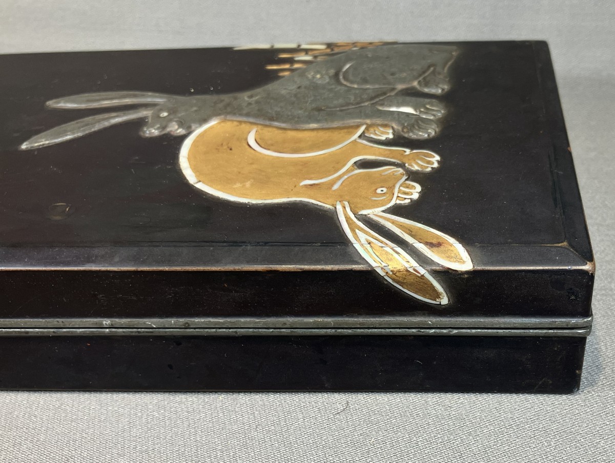 ... dûe à une façon empirique de réduire l'or en poudre. Il n'y a pas de signature alors que les copies sont presque toutes systématiquement signées. En 1996, une boite au décor identique fût vendue par Christie's à Londres. Le sujet du couple de lapins devant la lune est très apprécié au Japon car il fait référence à une légende millénaire, il symbolise le bonheur conjugal. L'extérieur est austère avec les 2 lapins en étain et nacre sur fond de nuit contrastant avec un intérieur richement doré et une grande pleine lune grise, détails en feuilles d'or. Il s'agit d'une œuvre de Korin créée dans sa pleine maturité artistique aux environ de 1700. Bon état exceptionnel, aucune restauration quelques usures et chocs, tous visibles sur photos. C'est une oeuvre d'exception digne de figurer dans les plus grandes collections d'art japonais.