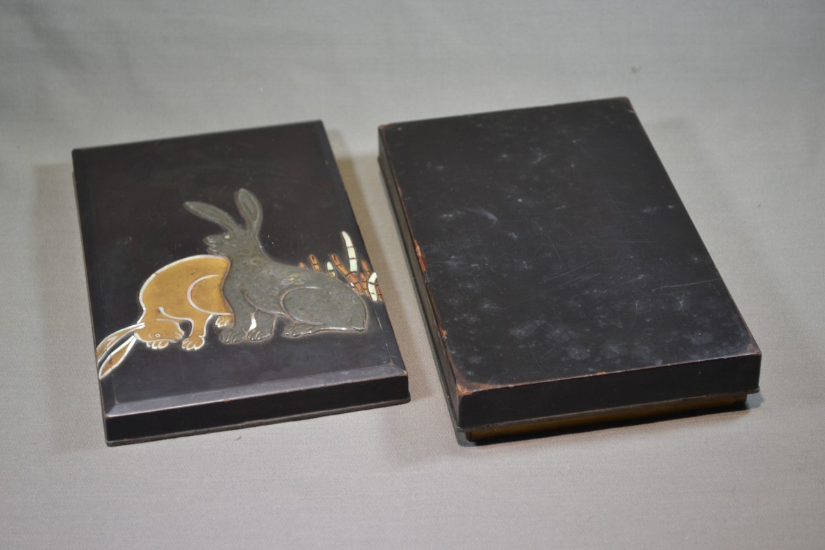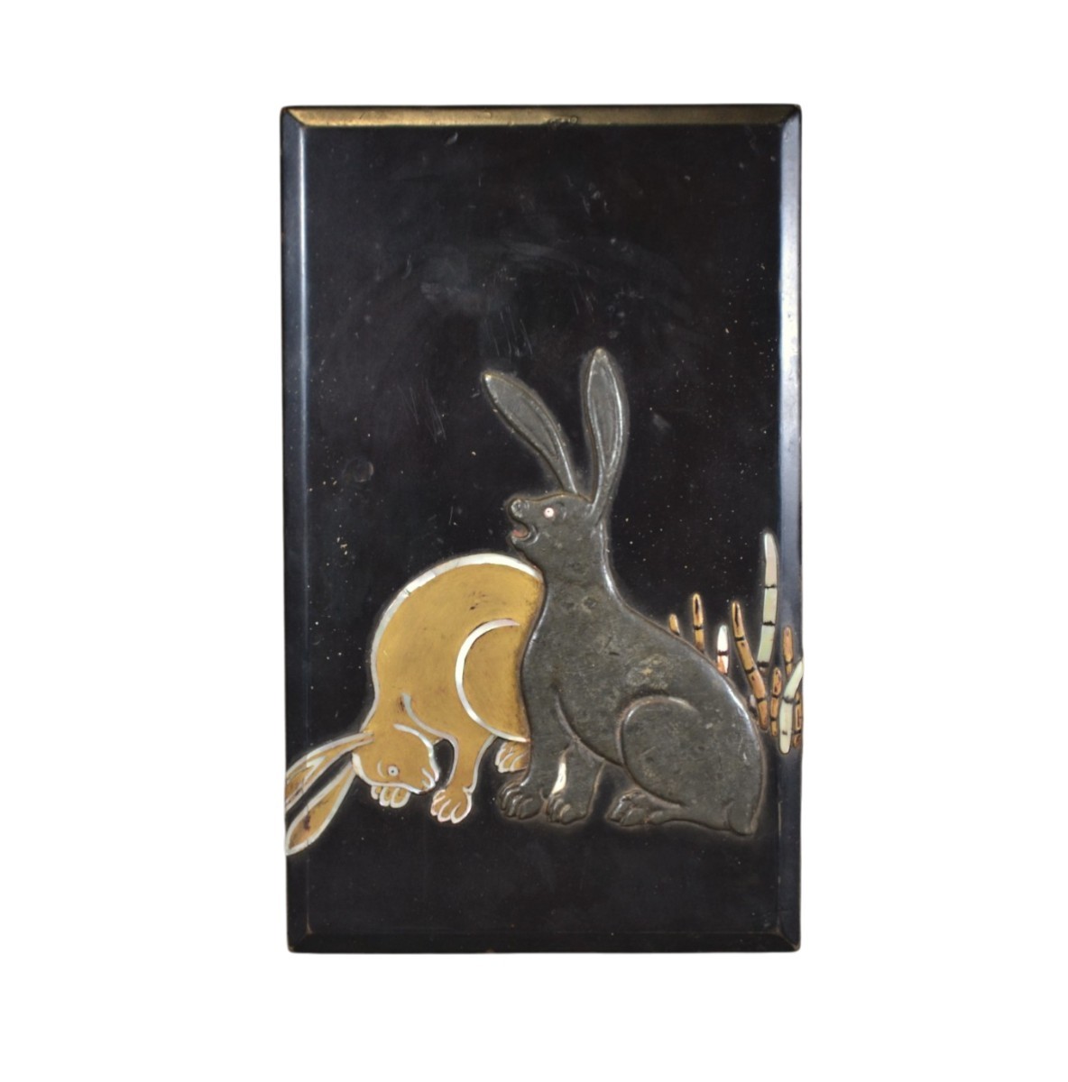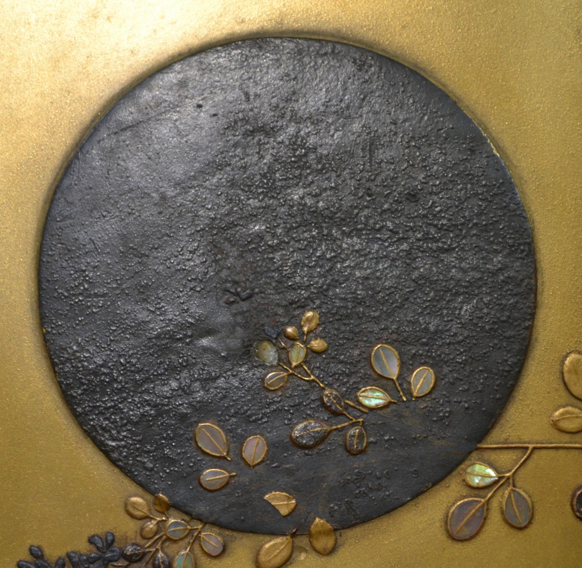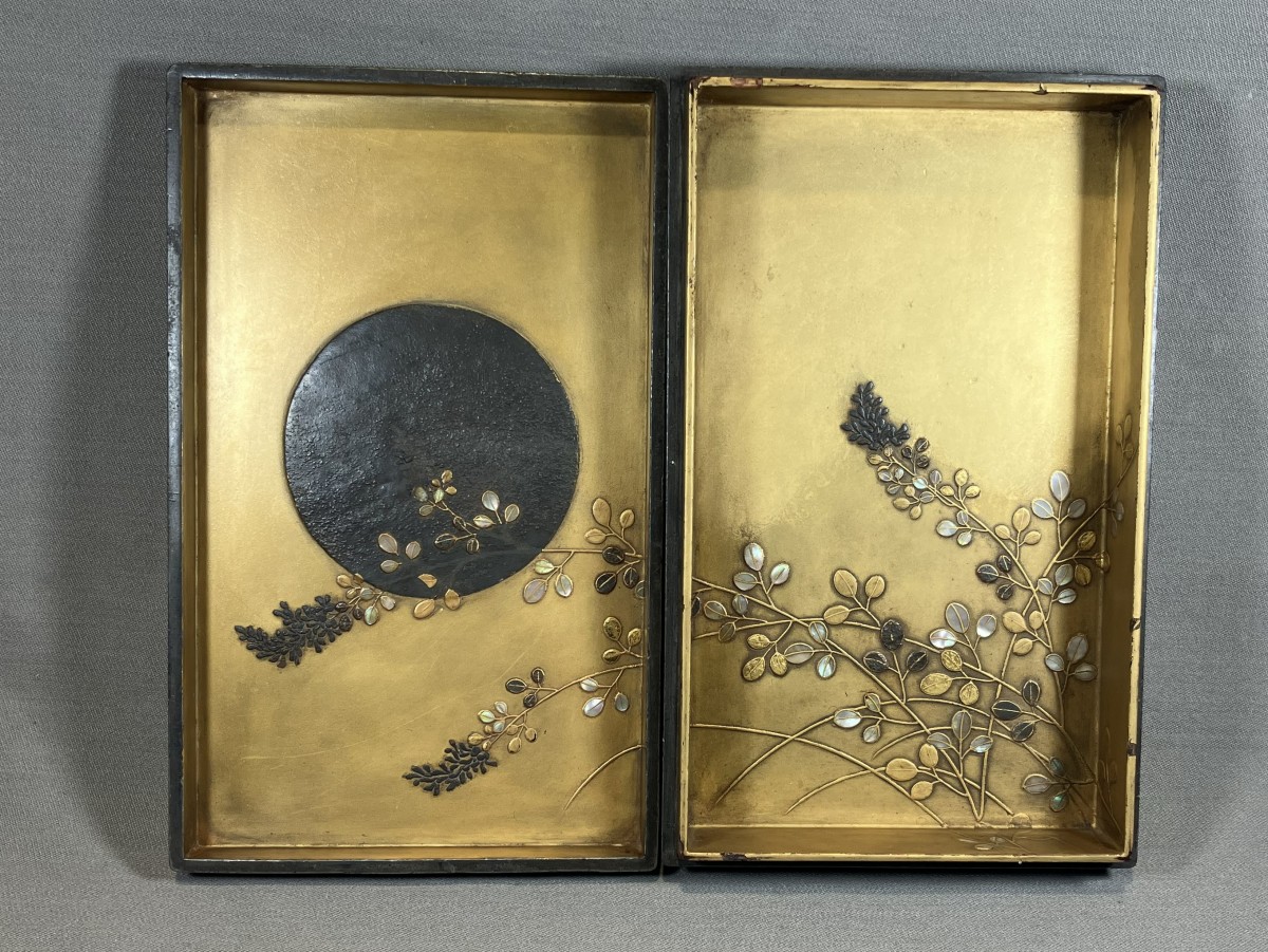 ... dûe à une façon empirique de réduire l'or en poudre. Il n'y a pas de signature alors que les copies sont presque toutes systématiquement signées. En 1996, une boite au décor identique fût vendue par Christie's à Londres. Le sujet du couple de lapins devant la lune est très apprécié au Japon car il fait référence à une légende millénaire, il symbolise le bonheur conjugal. L'extérieur est austère avec les 2 lapins en étain et nacre sur fond de nuit contrastant avec un intérieur richement doré et une grande pleine lune grise, détails en feuilles d'or. Il s'agit d'une œuvre de Korin créée dans sa pleine maturité artistique aux environ de 1700. Bon état exceptionnel, aucune restauration quelques usures et chocs, tous visibles sur photos. C'est une oeuvre d'exception digne de figurer dans les plus grandes collections d'art japonais.