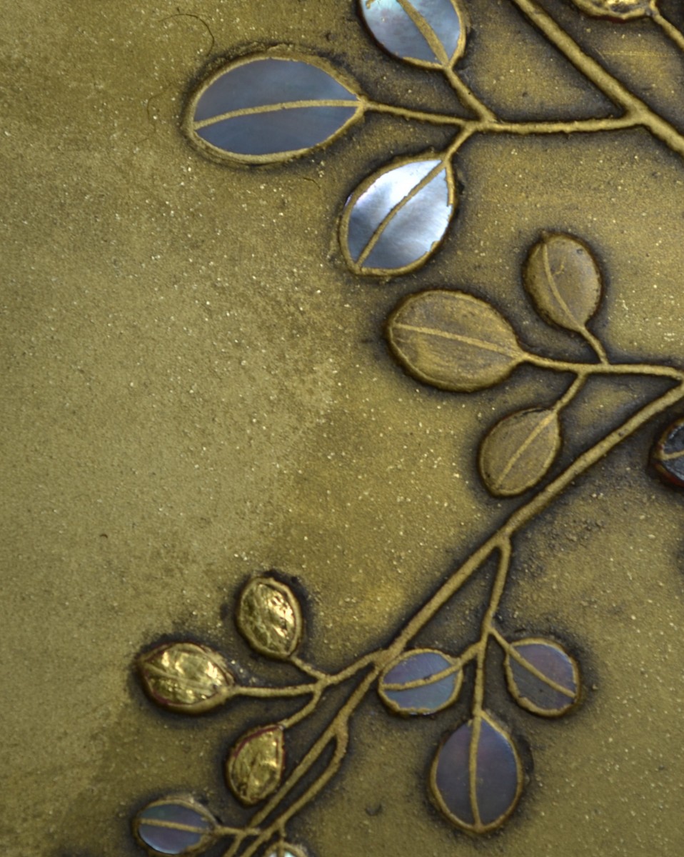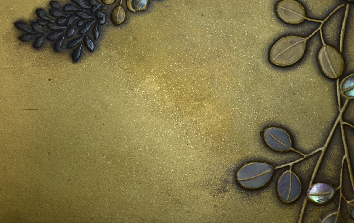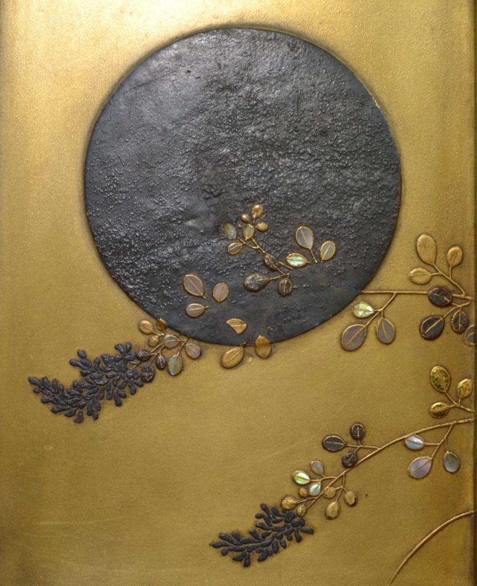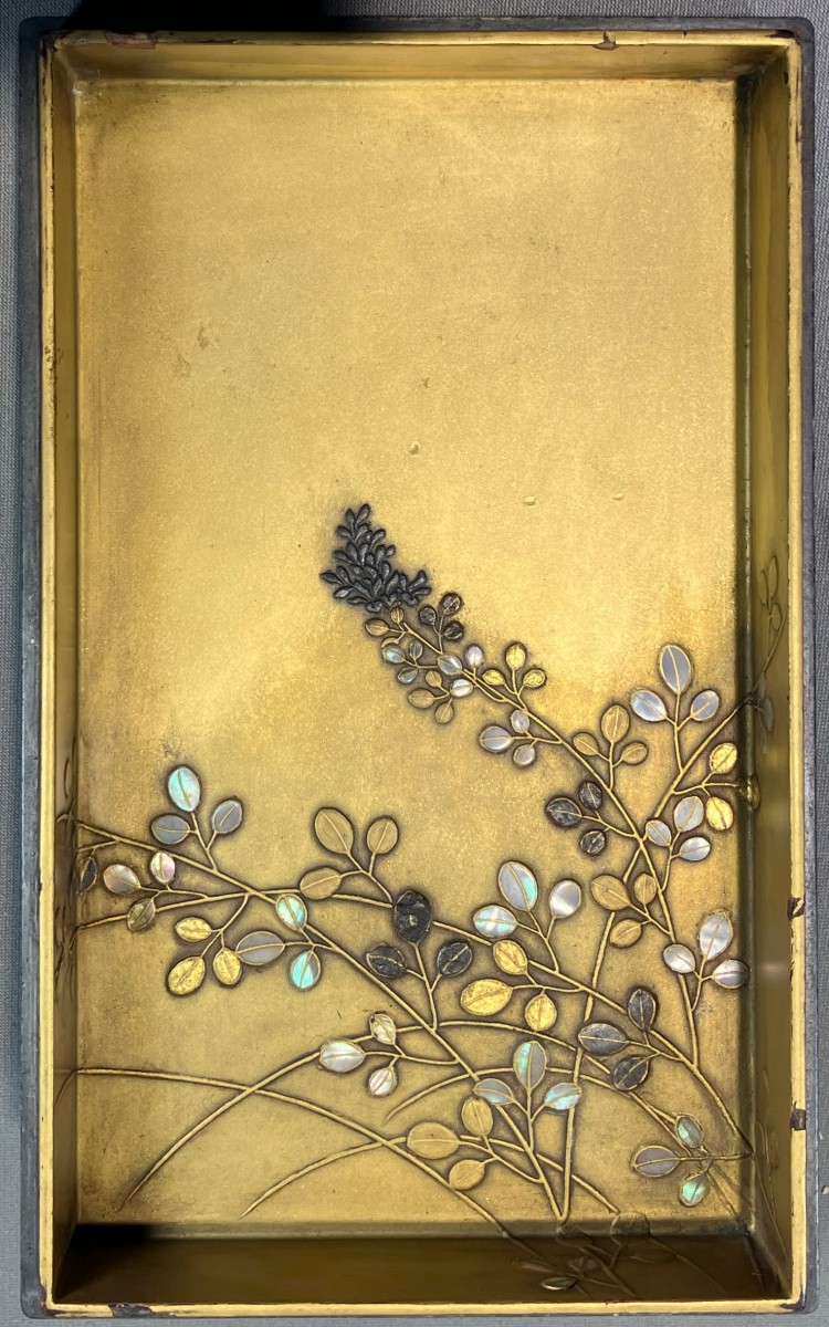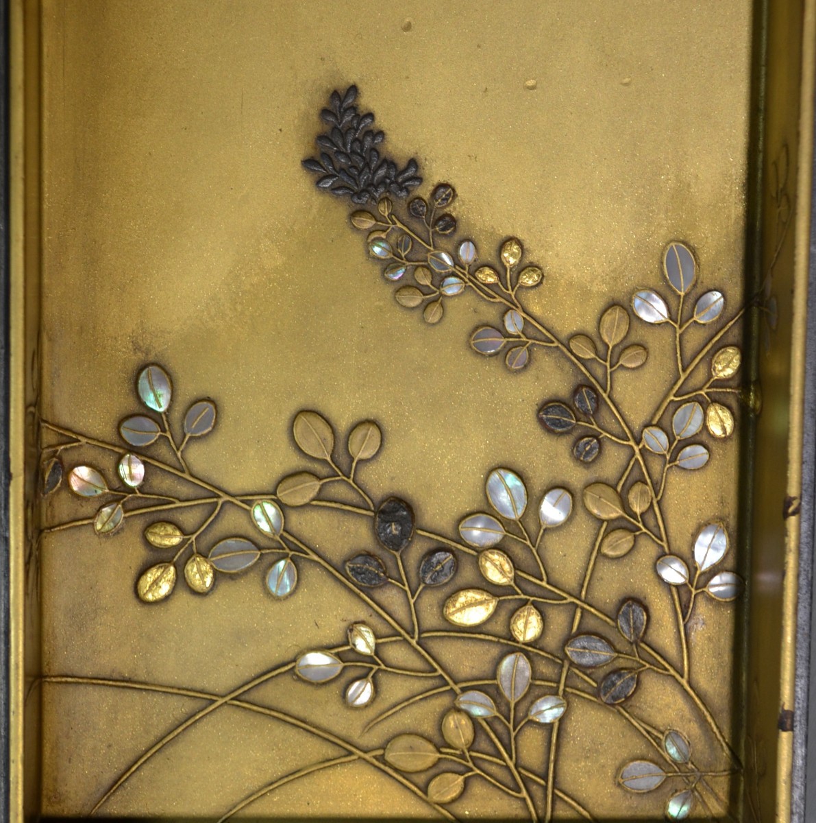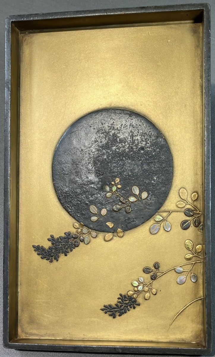 Boite en bois, recouvert de laque noire (roïro) décor Takamakiyé (laque en relief) de poudre d'or, décorée d'incrustations d'étain et de nacre.Les bords sont renforcés d'étain. Il s'agit là d'une œuvre exceptionnelle de Ogata Korin (1658-1716) qui fût le meilleur artiste de son époque. Ses œuvres ont été largement copiées dés le 18° siècle et durant tout le 19°siècle. Un usage pluriséculaire a usé la laque, cette dernière, malgré les multiples chocs qu'elle a subit, ne s'est nulle part écaillée: preuve de sa qualité exceptionnelle, il en va de même pour les incrustations dont aucune ne manquent . Un vieil ouvrage Japonais précisait que les poudres d'or utilisées par Ogata avaient des grains irréguliers ,certains plus gros que les autres, sur les photos agrandies de notre suzuribako on peut voir ces rares grains qui brillent, et qui sont absents sur les copies. On ne sait pas si cette subtile particularité était voulu par l'artiste ou si elle était ...
