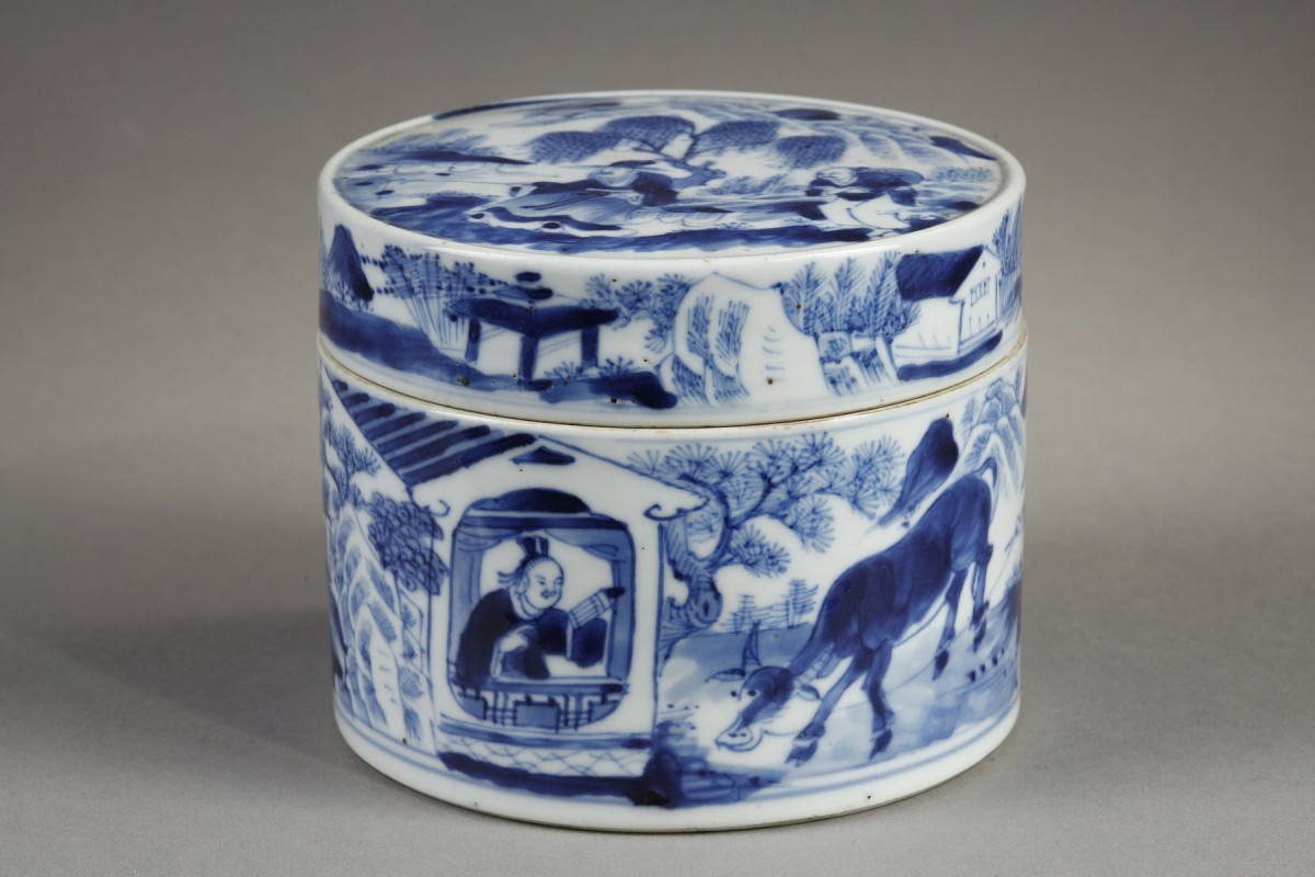 Boite en porcelaine bleu blanc à decor de personnages et animaux . L interieur garni d une coupelle comportant une petite calligraphie - Marque de collectionneur Ruoshen Zhencang sous la base Chine 19em siècle pour le Vietnam
