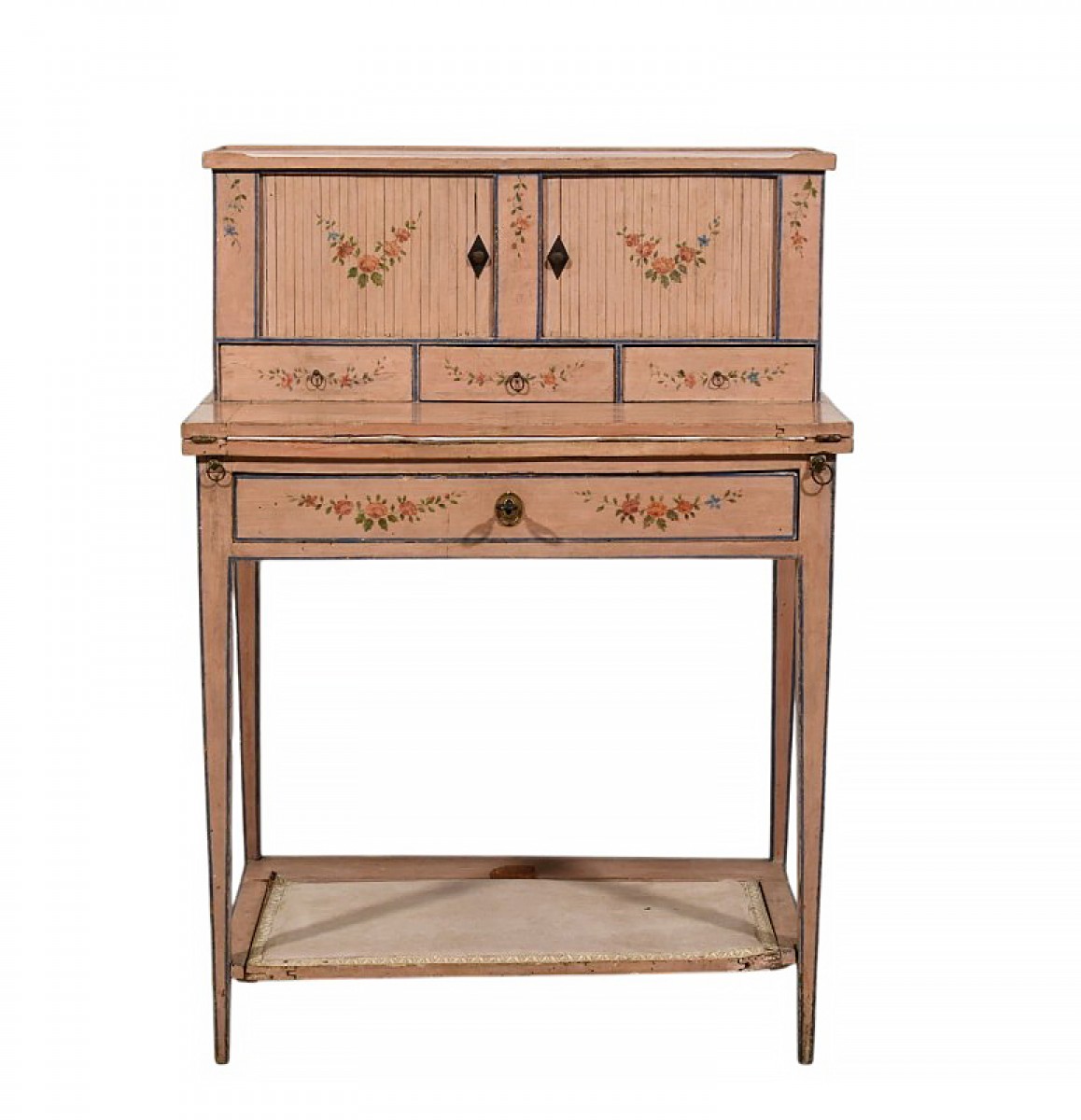 La structure est articulée par une alzata supérieure munie de deux petites serrandes coulissantes dissimulant deux compartiments, ainsi que de trois tiroirs inférieurs. Le plateau principal est rabattable, permettant d’augmenter la surface d’écriture tout en préservant la laque d’origine lors de l’utilisation — un dispositif fonctionnel typique des meubles d’écriture les plus raffinés. Une fois ouvert, l’abattant repose sur deux tirettes latérales assurant son soutien et sa stabilité.