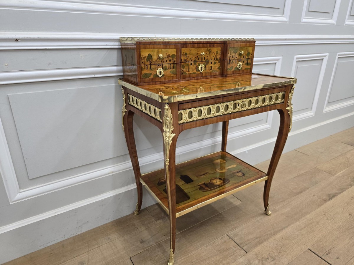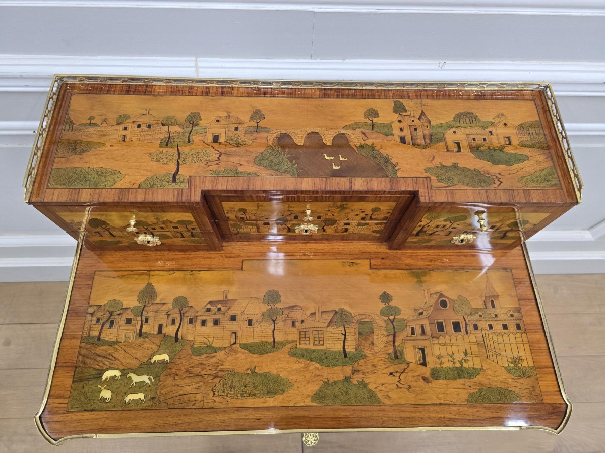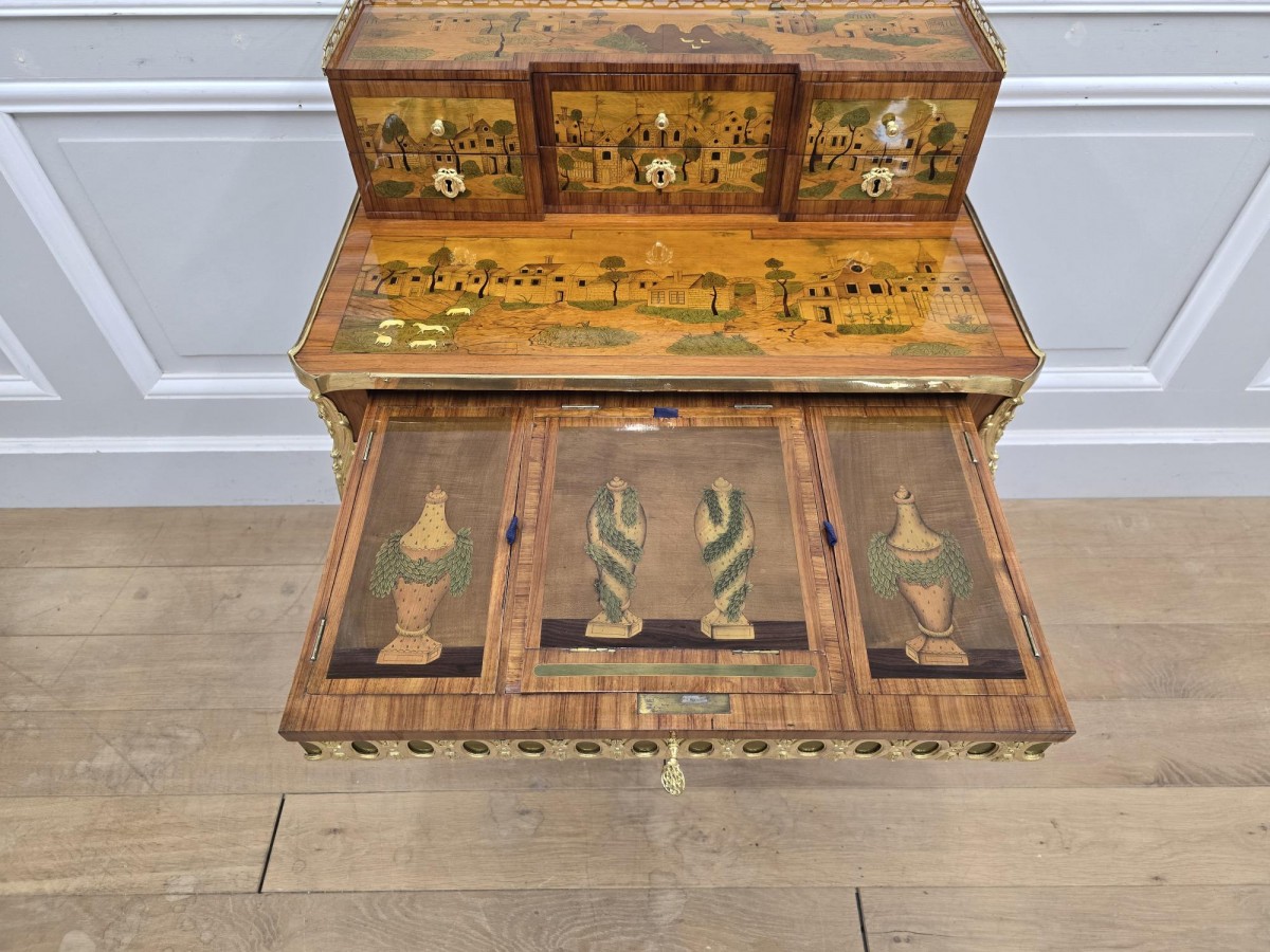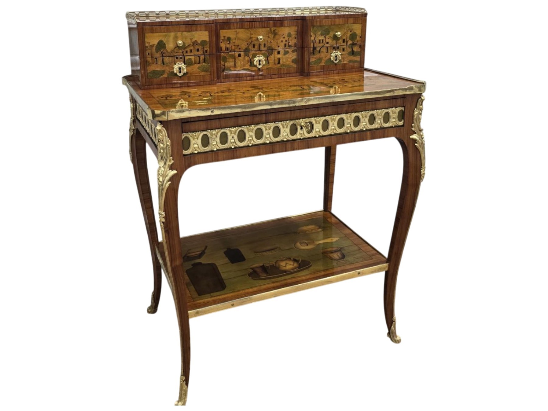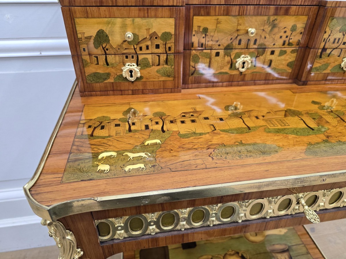 Bonheur du jour d'époque Transition, richement marqueté de paysages sur fond de sycomore teinté encadré de bois de rose. Il ouvre par six tiroirs dans sa partie haute, et un tiroir en ceinture, laissant découvrir deux vantaux marquetés de vases et d'un pupitre au centre avec un secret. Riche ornementation de bronzes ciselés et dorure d'origine. Attribué à Pierre Roussel (1723-1782) Ébéniste. Maîtrise le 21 août 1745. Très habile marqueteur, Roussel a laissé une production abondante, diverse et d'excellente qualité.