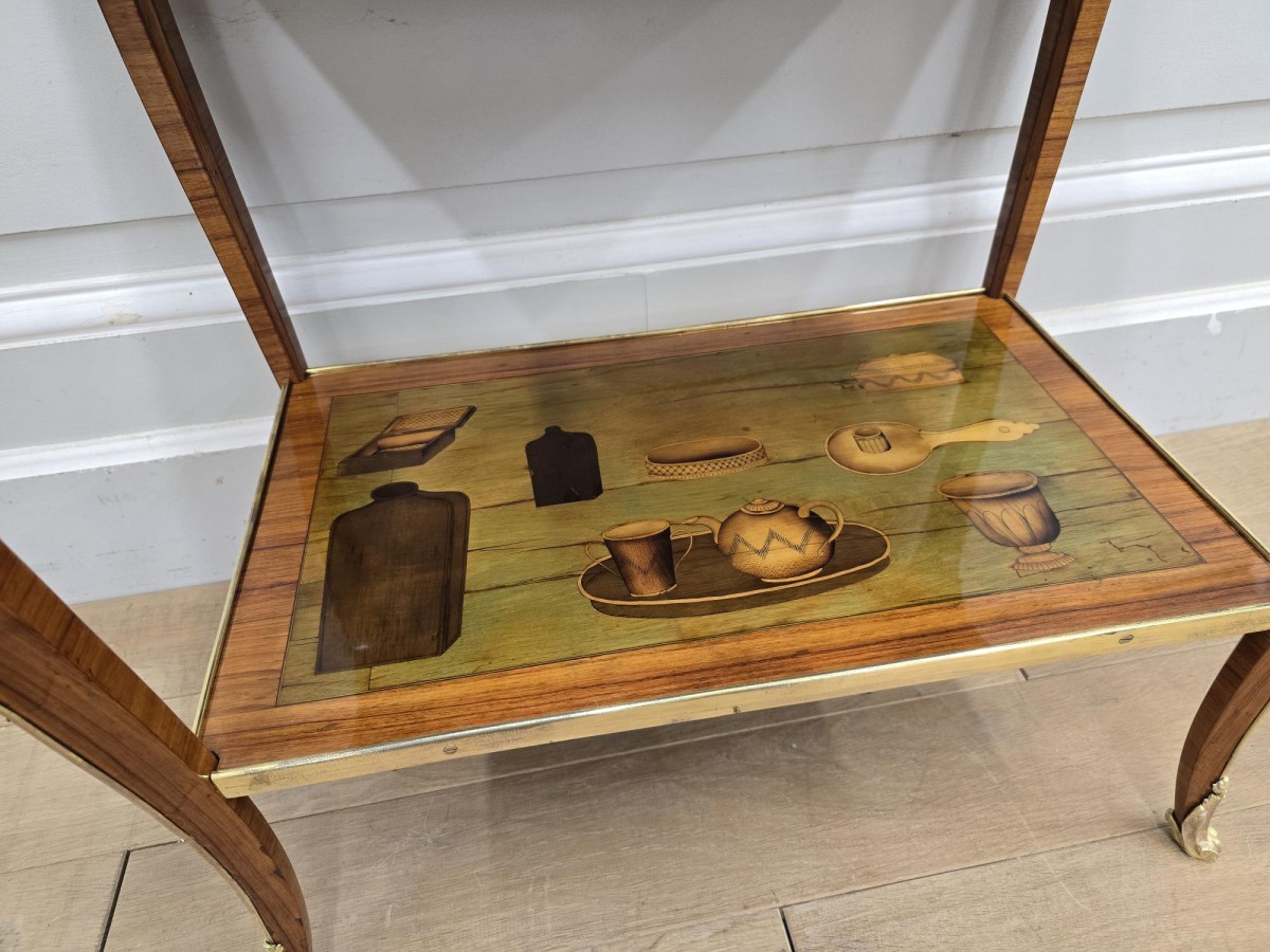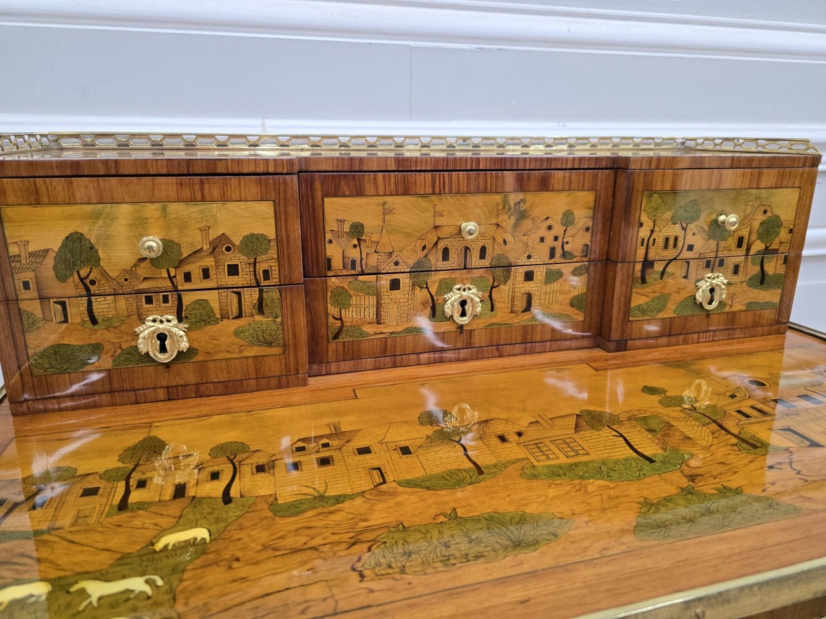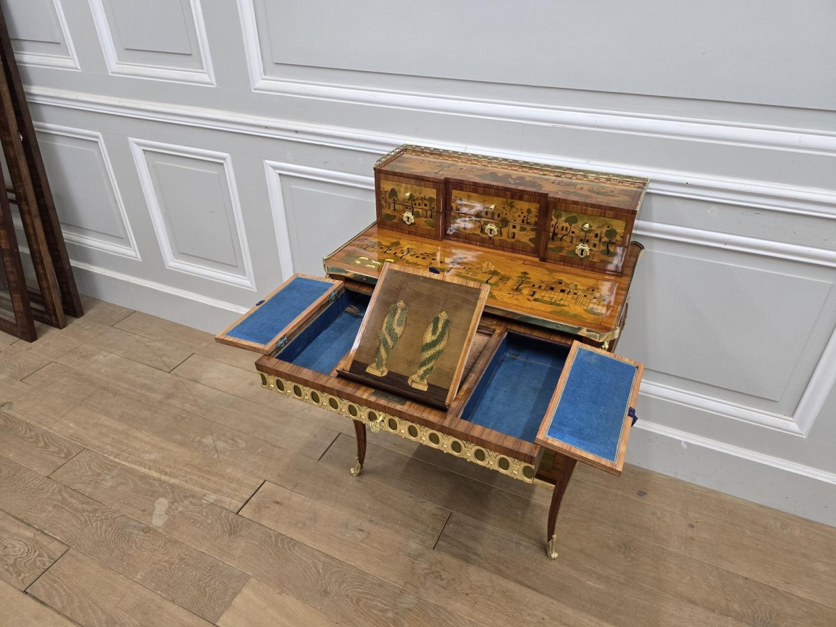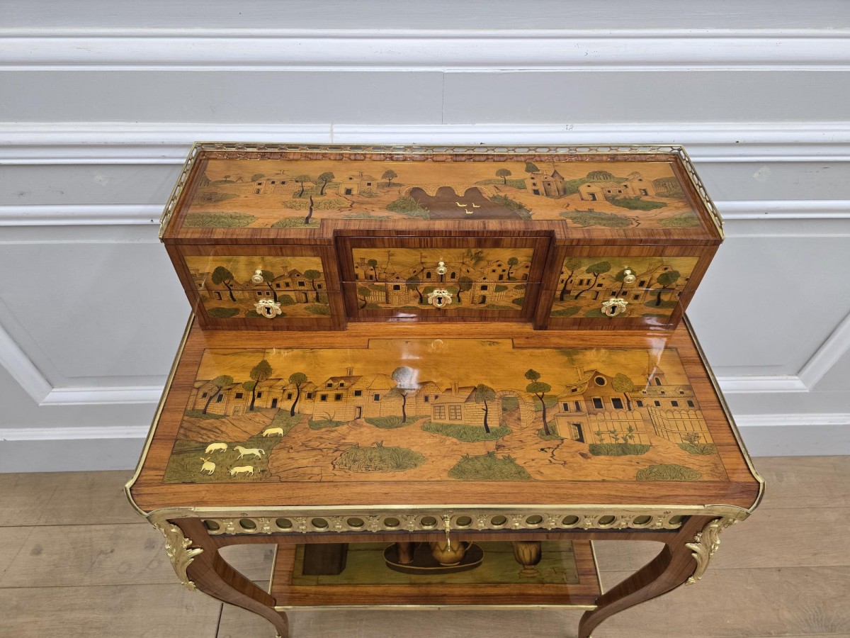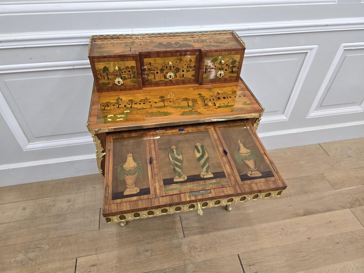 Bonheur du jour d'époque Transition, richement marqueté de paysages sur fond de sycomore teinté encadré de bois de rose. Il ouvre par six tiroirs dans sa partie haute, et un tiroir en ceinture, laissant découvrir deux vantaux marquetés de vases et d'un pupitre au centre avec un secret. Riche ornementation de bronzes ciselés et dorure d'origine. Attribué à Pierre Roussel (1723-1782) Ébéniste. Maîtrise le 21 août 1745. Très habile marqueteur, Roussel a laissé une production abondante, diverse et d'excellente qualité.