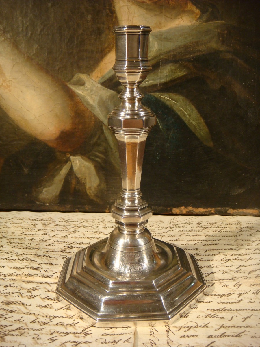 Bougeoir à pans en Argent massif sur une base octogonale portant des armoirie d’alliance surmontées d’une couronne comtale. Ce bougeoir porte les poinçons aux fermiers généraux de charge de la ville d’Angers , le P couronné lettre date de 1729 et le poinçon du maître Orfèvre Nicolas Bedane , orfèvre à Angers de 1713 à 1732. Bougeoir d’époque début XVIIIe Siècle.