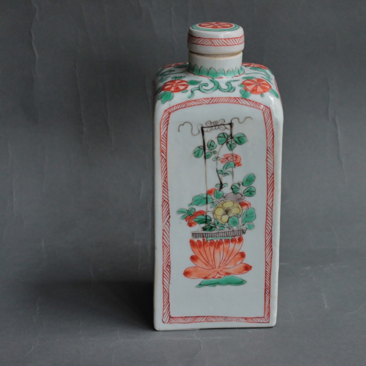 Bouteille carrée en porcelaine de Chine à décor polychrome aux émaux de la Famille Verte de vases stylisés garnis de bouquets de fleurs et feuillages encadré d'un ruban strié en rouge, rosaces et tiges feuillagées autour du col.