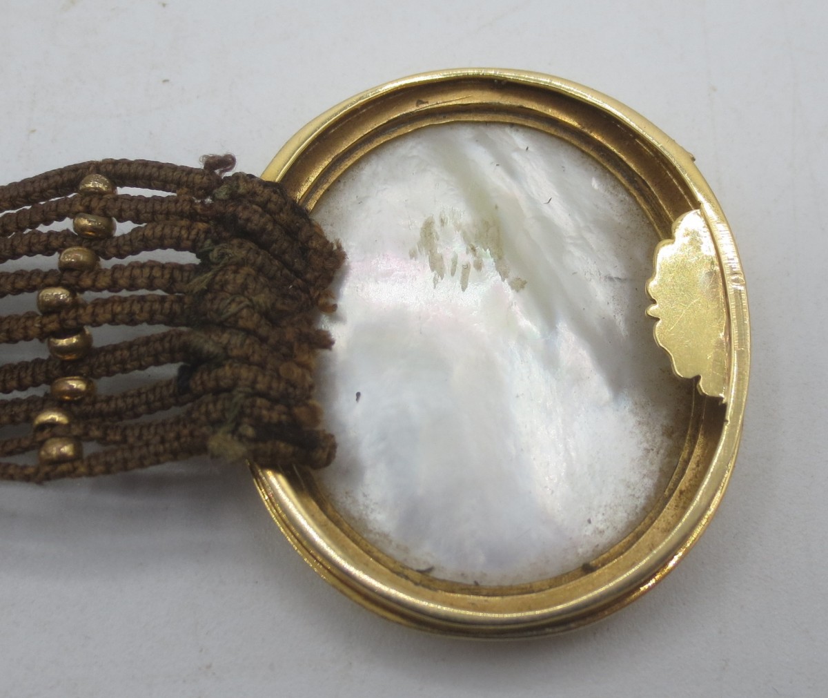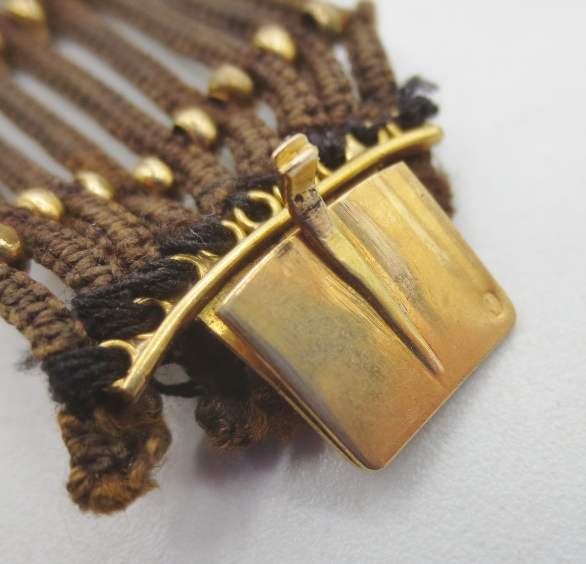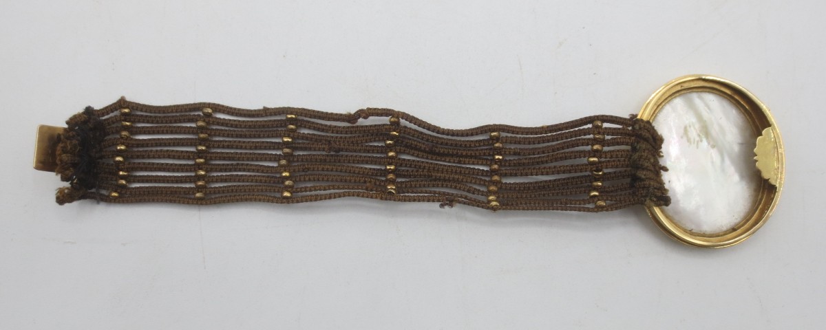 Ce bracelet en cheveux est orné sur le fermoir d'une miniature sous verre et cerclée d'or. Le tour de poignet est constitué de neuf tresses de cheveux intercalés de loin en loin d'une ligne de huit petites perles en métal doré. En bon état général il faut néanmoins signaler deux ou trois petits accrocs sur les tresses de cheveux et quelques petits chocs autour du médaillon. Le fermoir à cliquet porte pour poinçon de contrôle un hibou qui garanti un taux de 750/000.
