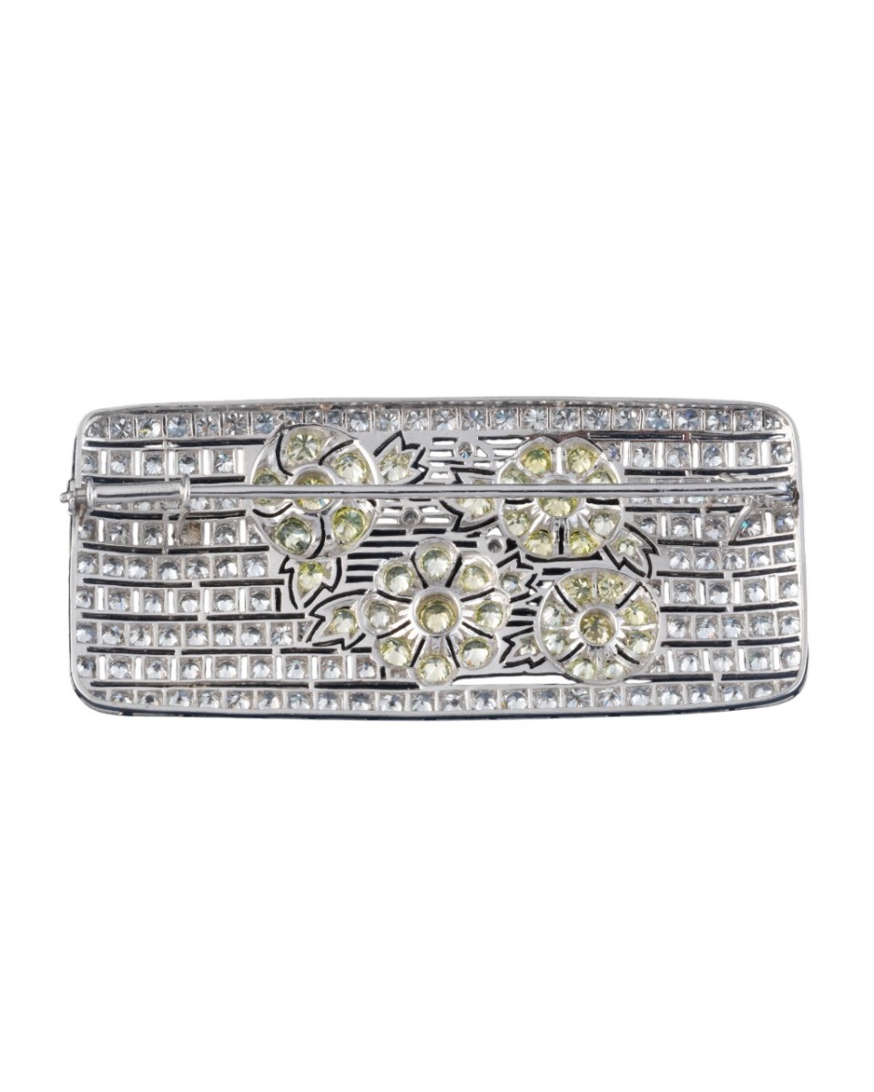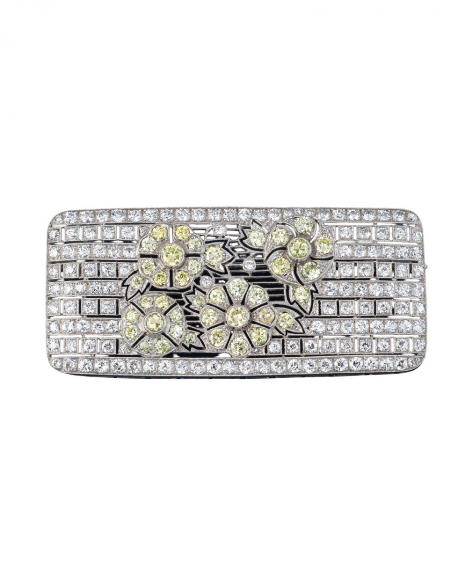 Broche en platine serti de diamants jaunes et verts, Poids: 19,30g Dimensions: 6.5x3 cm