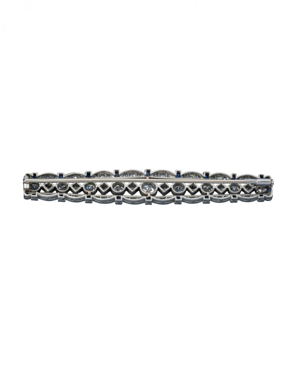 Broche barrette en platine, diamants et saphirs calibrés, années 1920. Dans son écrin. Poids: 8,60g, longueur: 7 cm