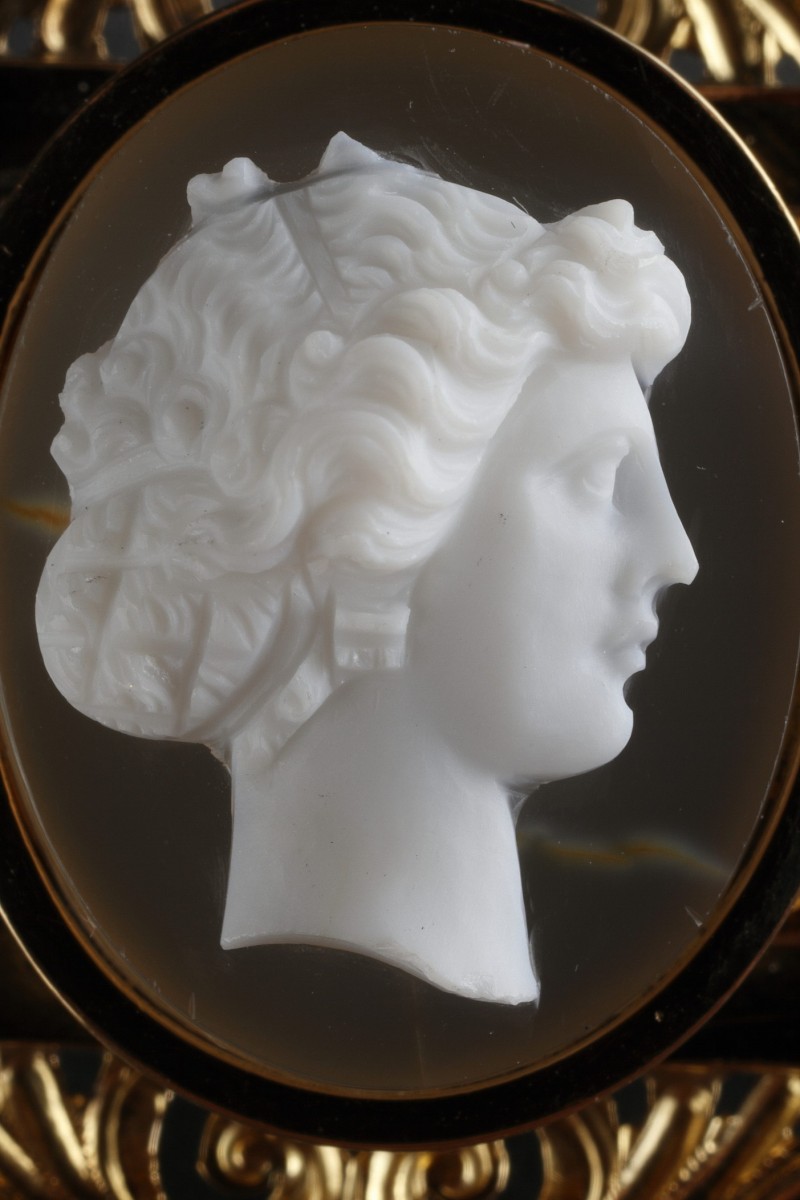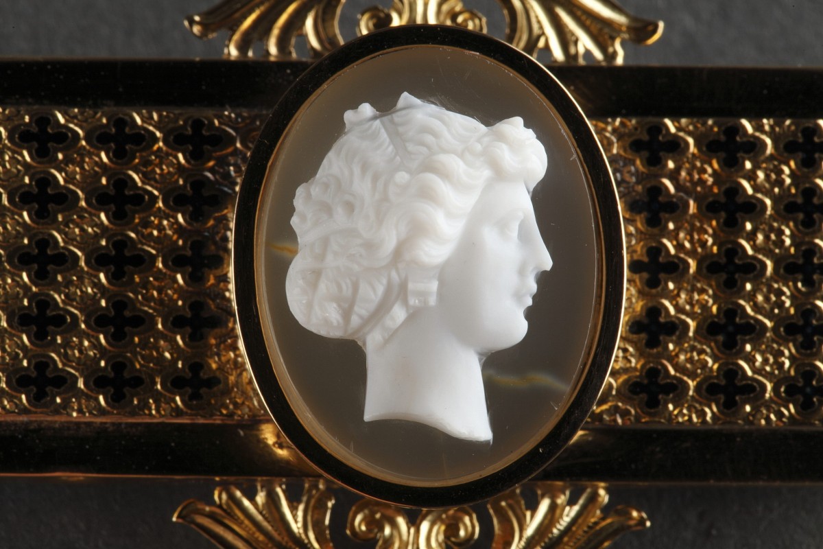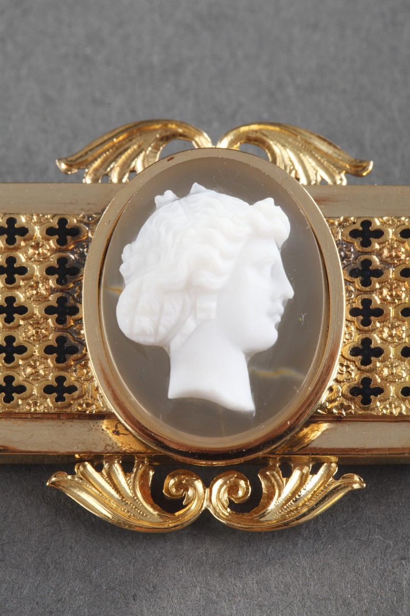 Broche en or décorée d'une camée agate à deux couches représentant le profil antique d'une femme, encadré de palmettes ajourées. Monture rectangulaire en or à pans coupés, très finement ciselée de fleurettes rehaussées de motifs polylobés émaillés noir. Maître orfèvre: A. Blanchet.