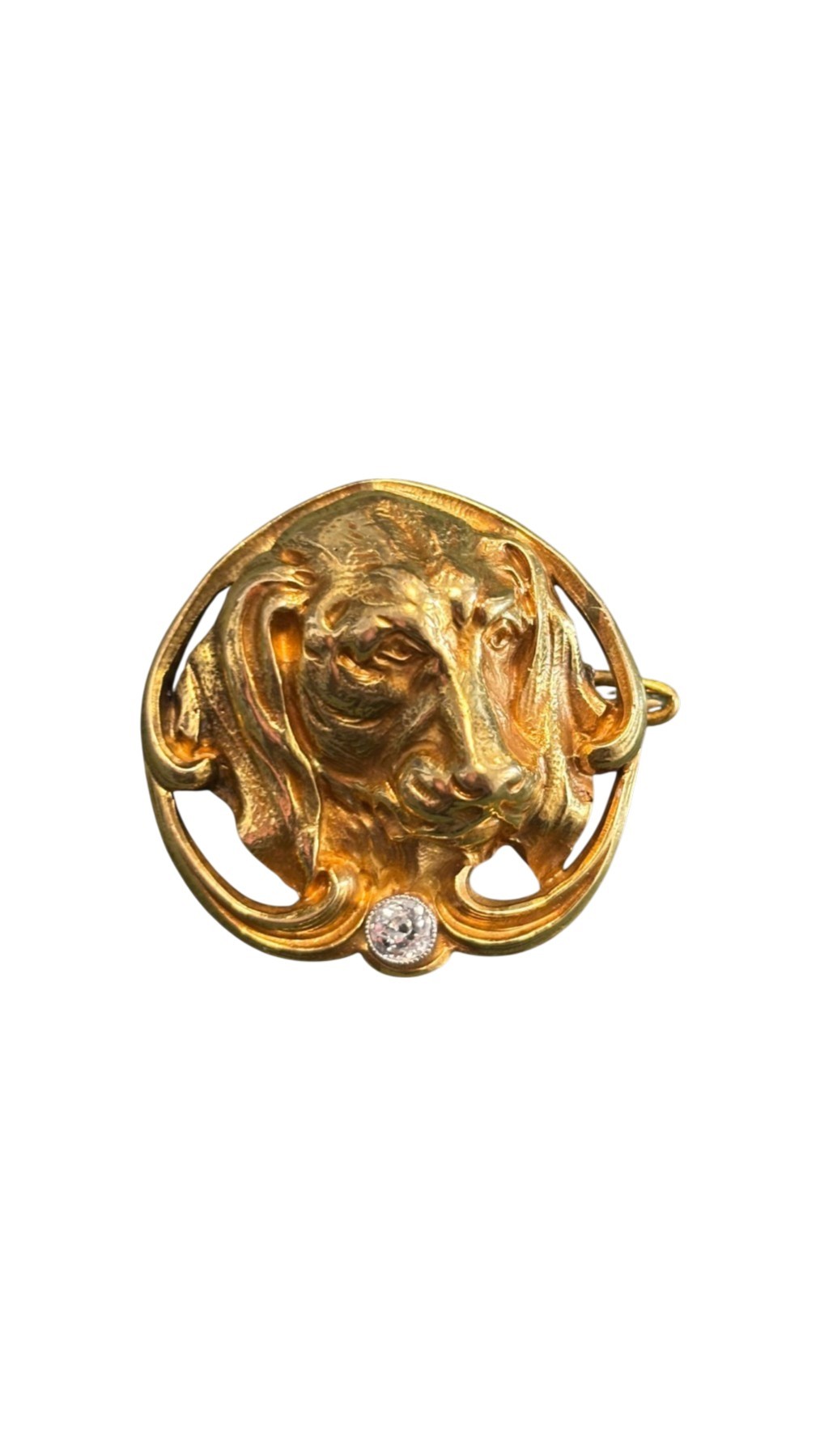Broche chien en or 18k, orné d`un diamant de taille ancienne, année 1900, Art Nouveau.