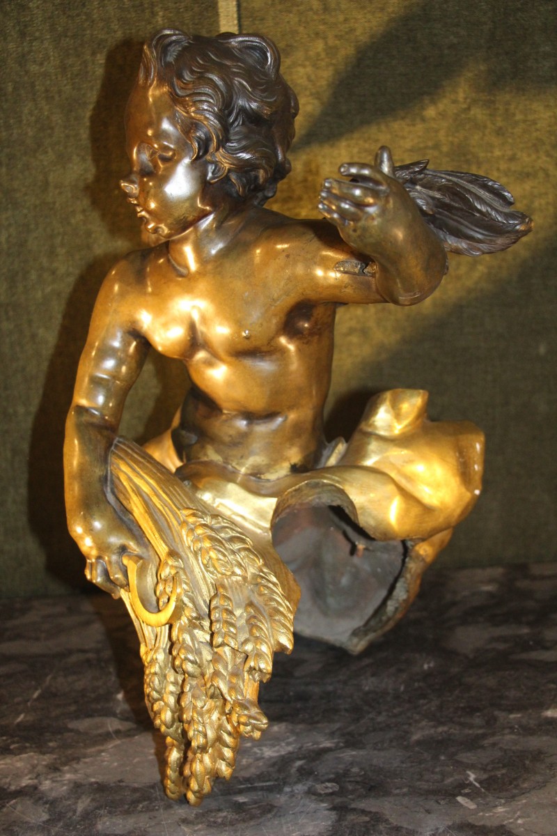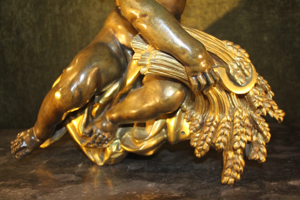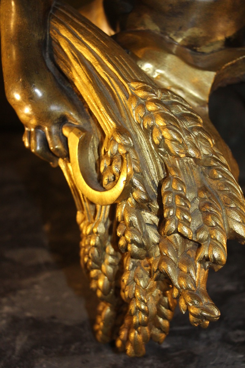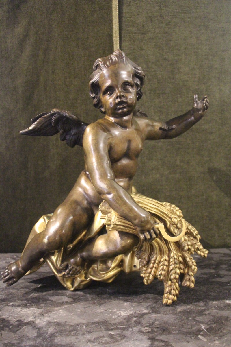 figurant un putti aux ailes déployées sur un drapé tenant de sa main droite une faucille et une gerbe de blé quant à elles en bronze doré.