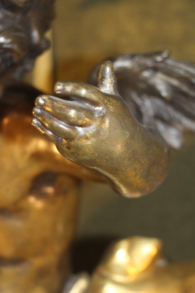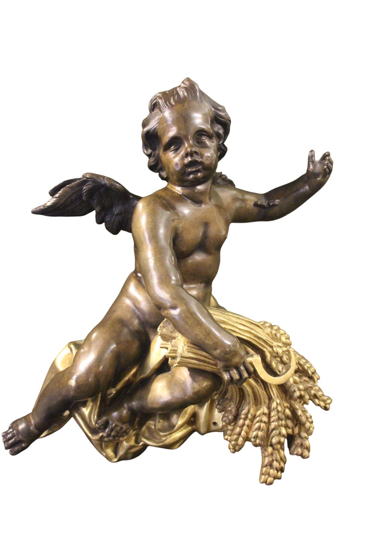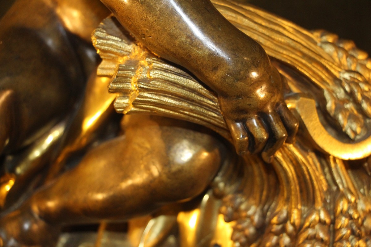 figurant un putti aux ailes déployées sur un drapé tenant de sa main droite une faucille et une gerbe de blé quant à elles en bronze doré.