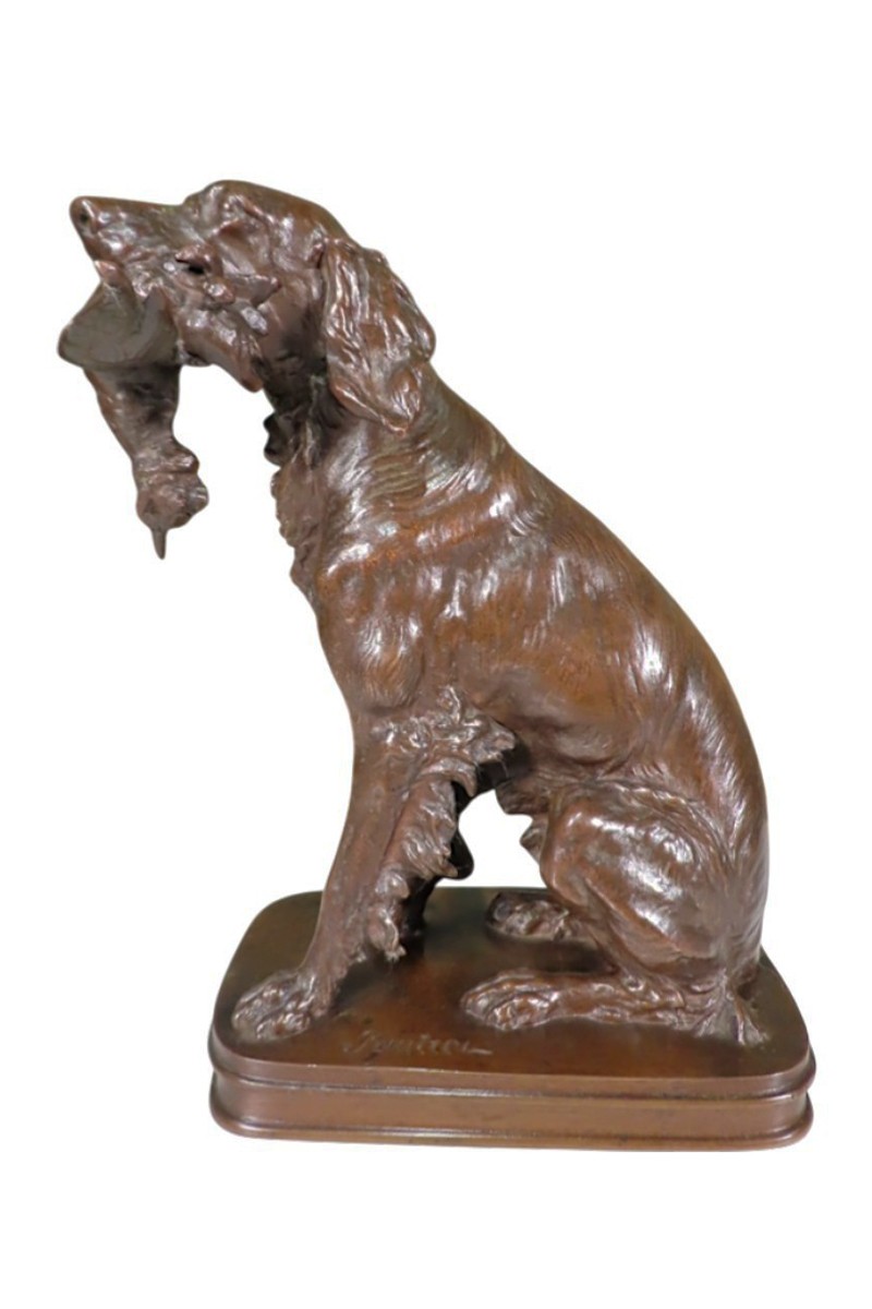 Bronze à patine brune représentant un chien de chasse Epagneul tenant une bécasse dans sa gueule, ce chien porte la signature sur la base Pautrot pour Ferdinand Pautrot ( 1832 – 1874 ) Ce bronze est en bel état il a conservé une très belle patine d’origine.