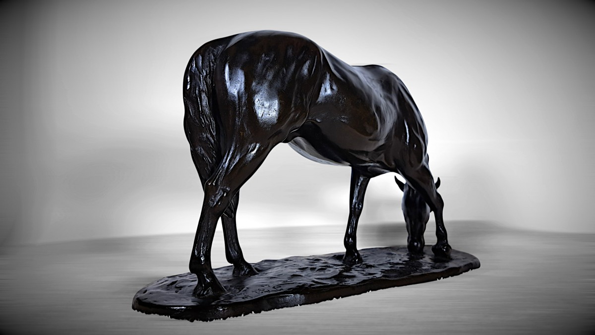 ... parfaitement toutes les qualités qui définissent l'œuvre de Kunio. Le cheval est représenté broutant dans un moment de naturalisme serein, la tête baissée dans une concentration paisible, sa musculature rendue avec un sens aigu de la structure et du rythme. Chaque surface est modelée avec un soin délibéré : l’encolure légèrement tendue, les épaules délicatement articulées, le subtil jeu de lumière sur les flancs. La patine – un brun profond, chaud et légèrement réfléchissant – a été appliquée avec une maîtrise consommée, enrichissant les volumes de la sculpture et lui conférant une présence élégante et intemporelle. Le socle, de forme irrégulière et à la texture organique, ancre le cheval avec une authenticité discrète tout en préservant l’immédiateté sculpturale de la main de Kunio.