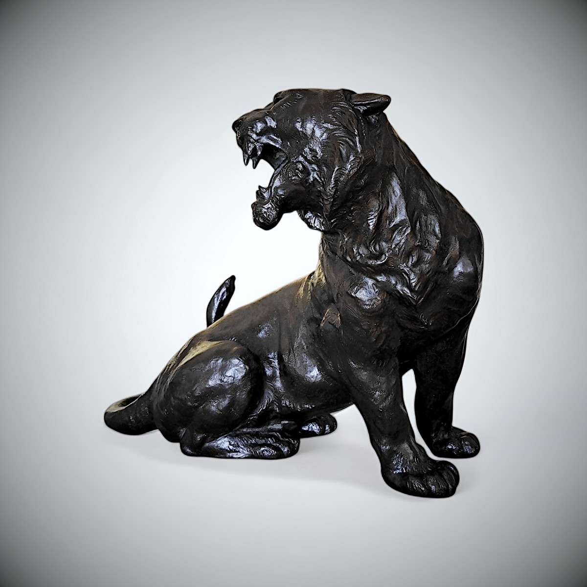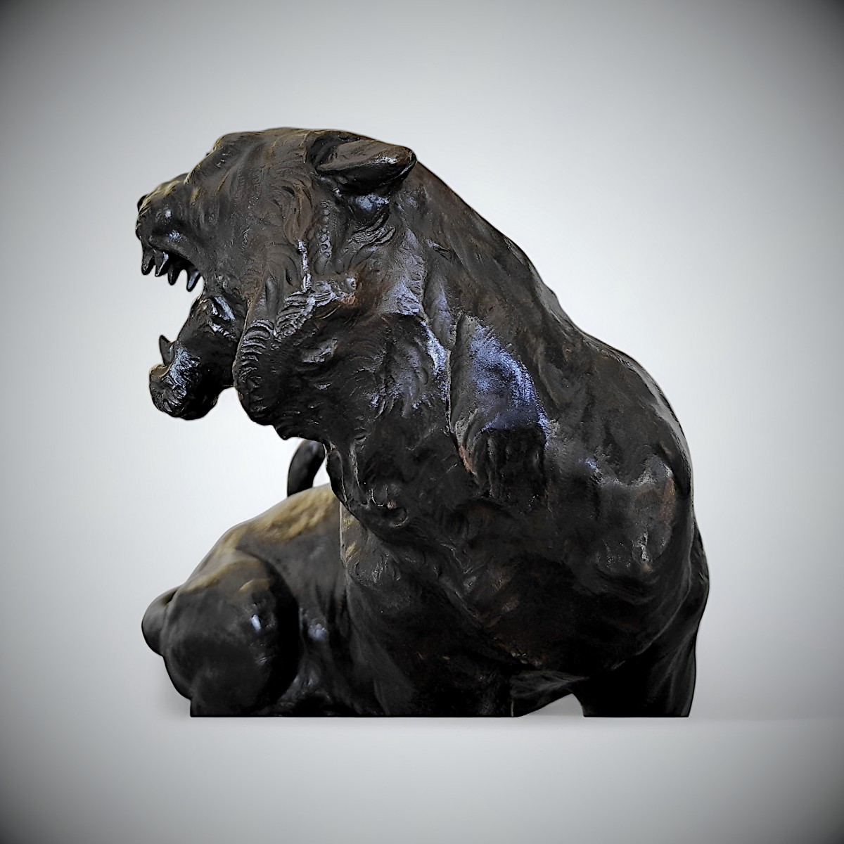 Le modelage du tigre témoigne du talent d'un sculpteur de génie, au sommet de sa maturité technique et artistique. La musculature se déploie avec naturel sous la peau : les épaules et les membres antérieurs expriment une force colossale, tandis que l'arrière-train, à la fois détendu et prêt à bondir, se distingue par de subtiles variations dans le traitement de la surface, contrastant avec la texture finement travaillée de la crinière et des traits du visage. L'inclinaison expressive de la tête vers le haut et les mâchoires légèrement ouvertes confèrent à l'animal une présence vivante et alerte indéniable.